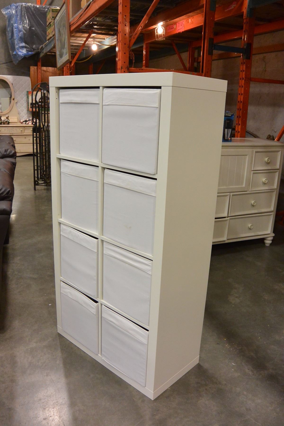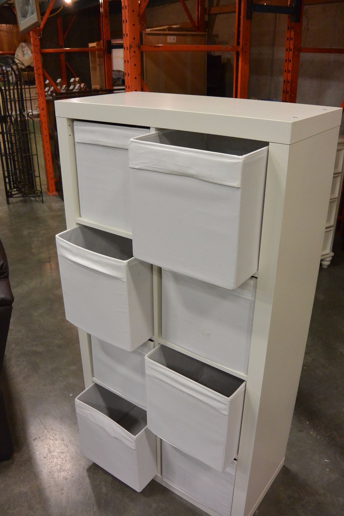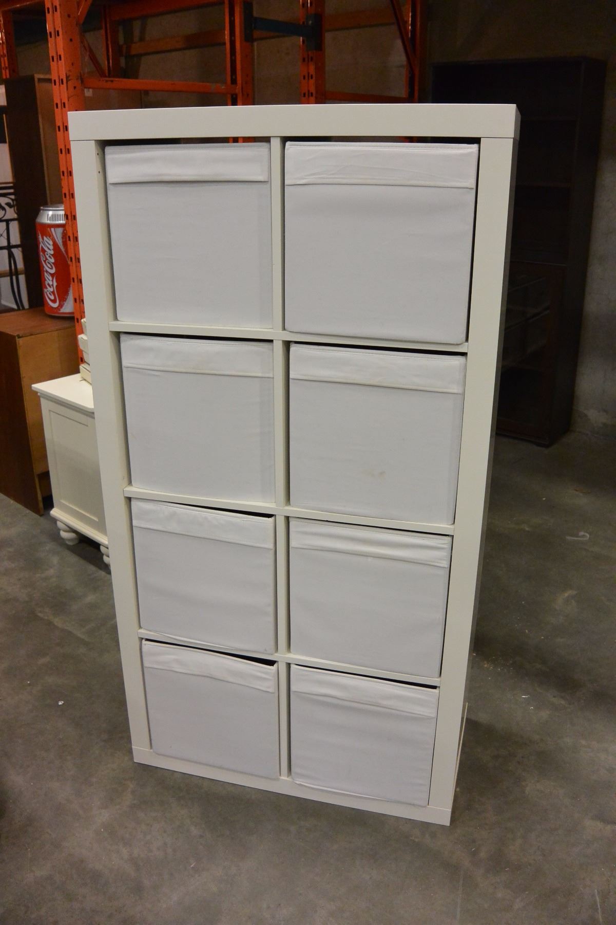 WHITE CUBICLE SHELF WITH FABRIC STORAGE BOXES