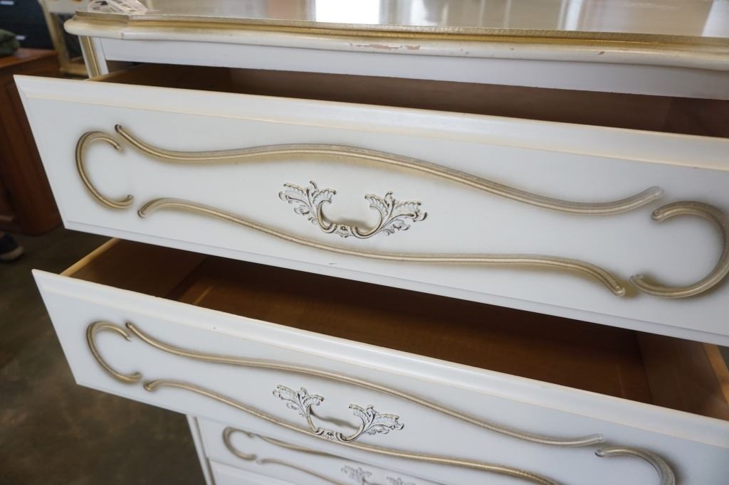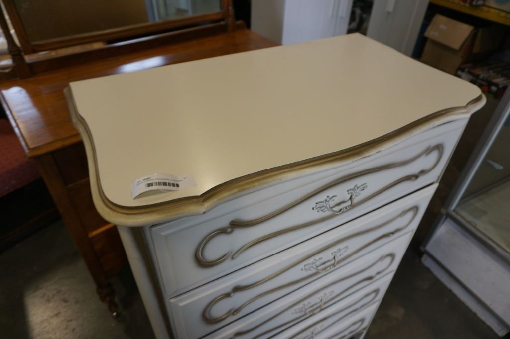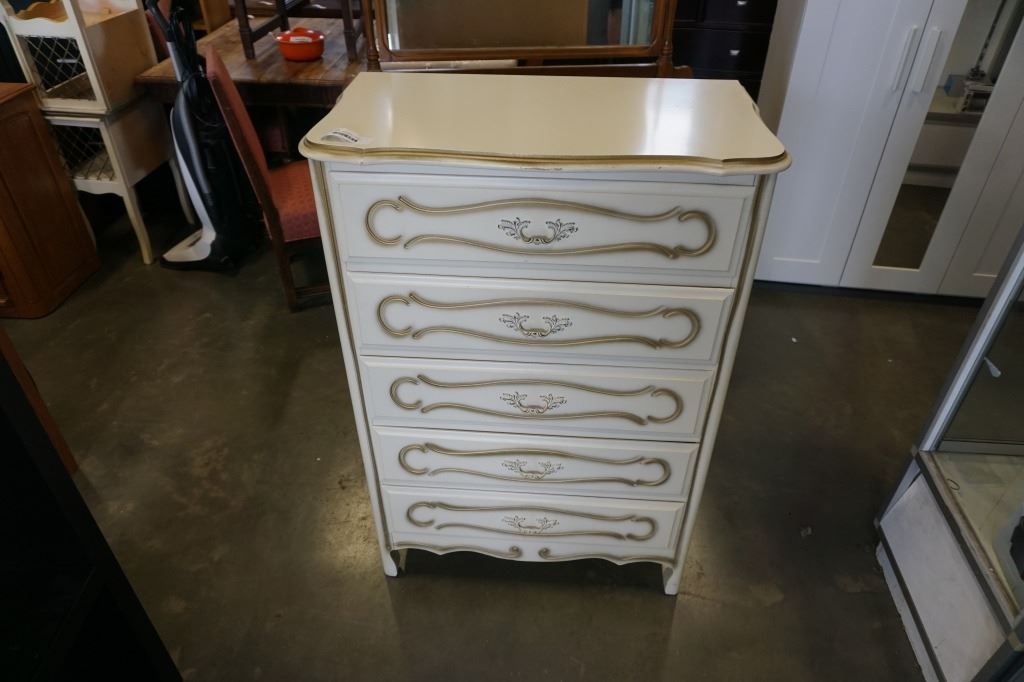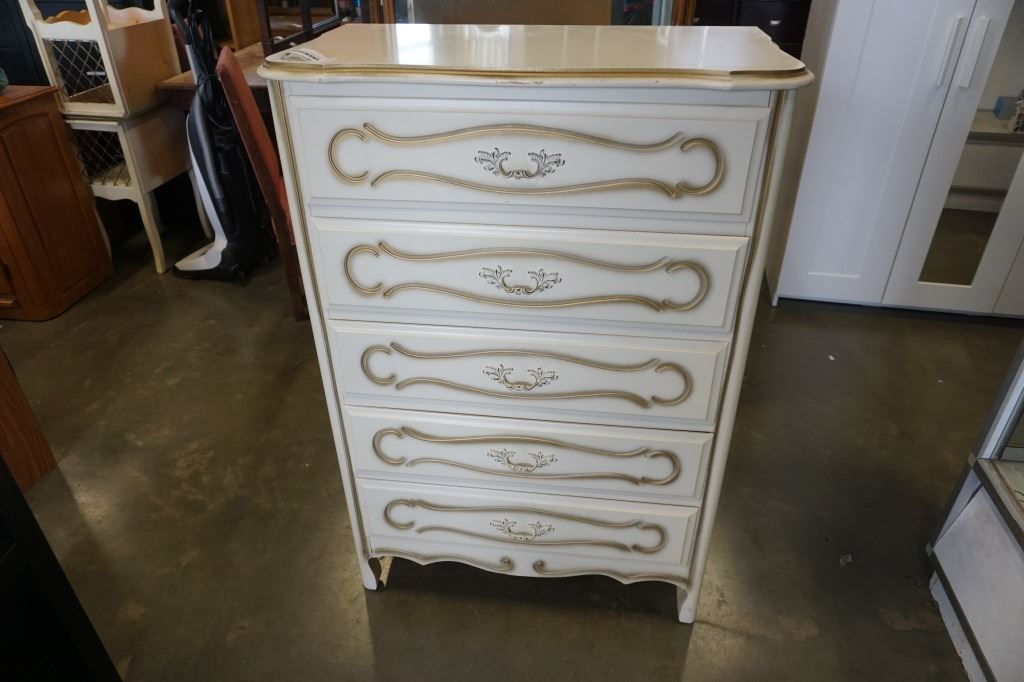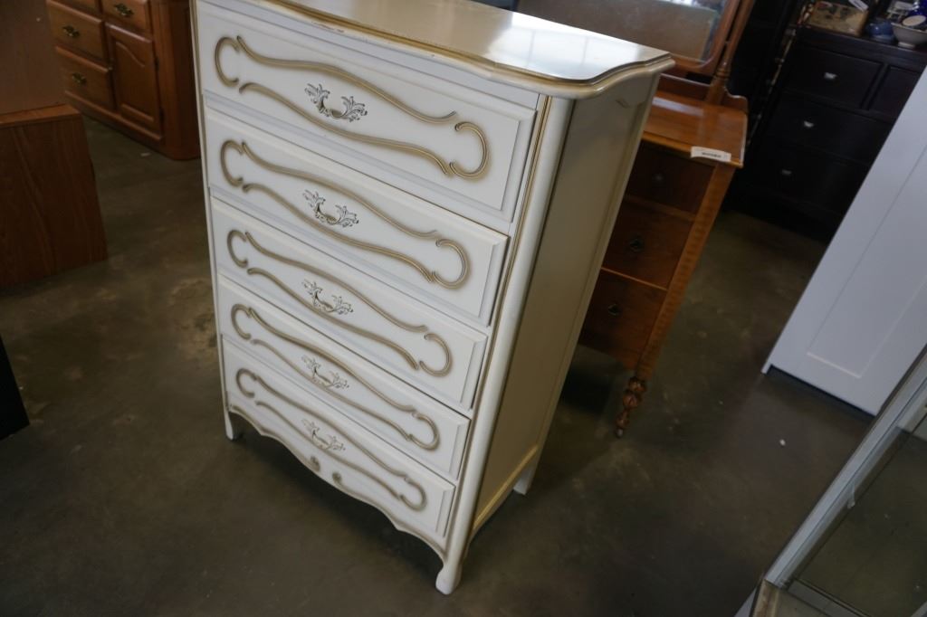 WHITE FRENCH PROVINCIAL 5 DRAWER CHEST OF DRAWERS - 32 INCH WIDE X 18 DEEP X 47 TALL