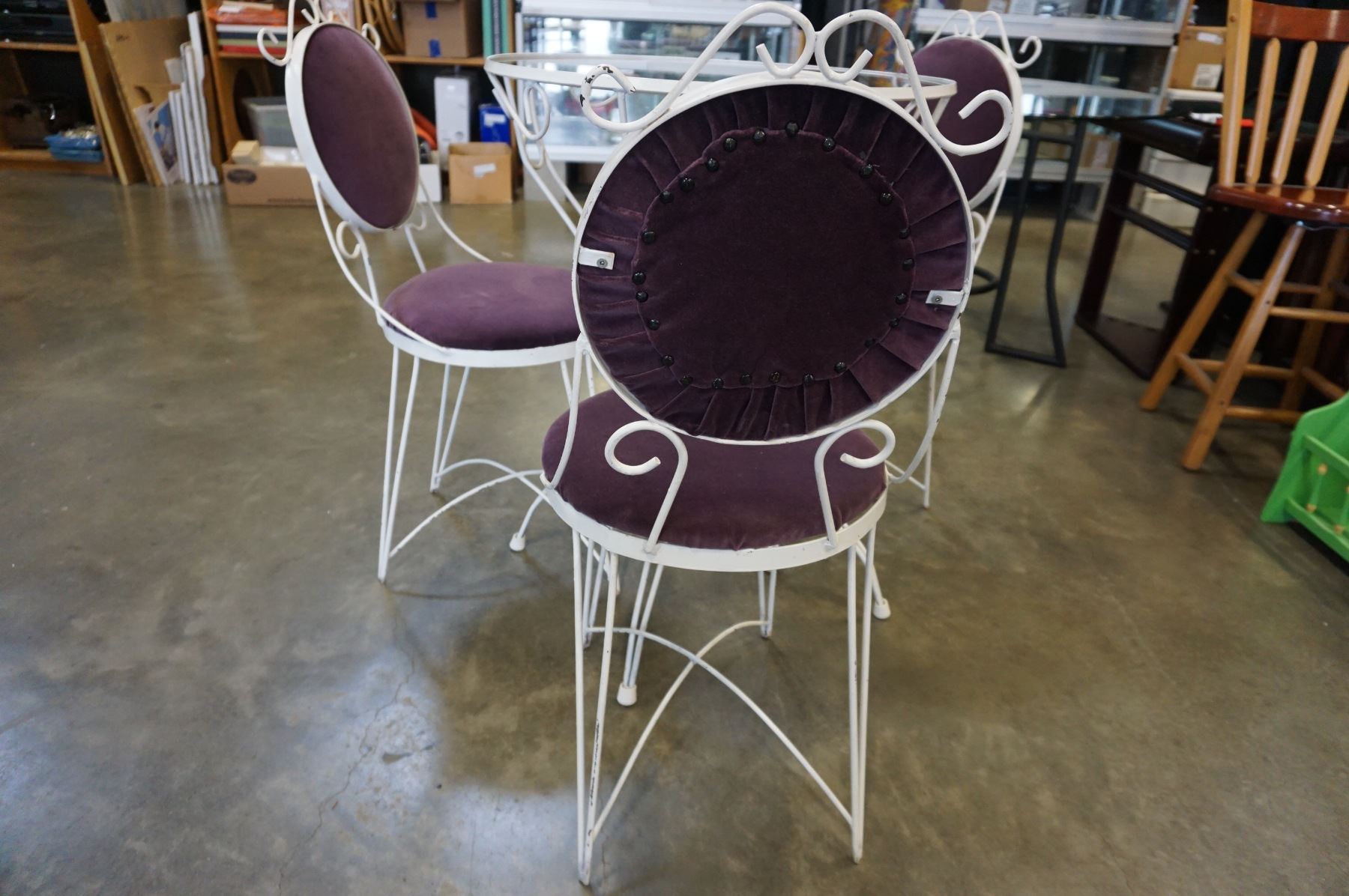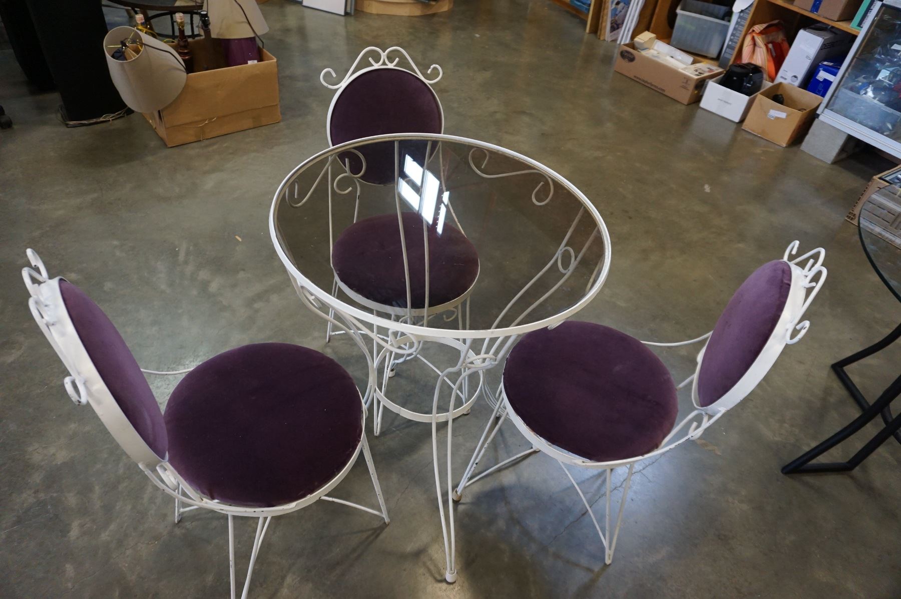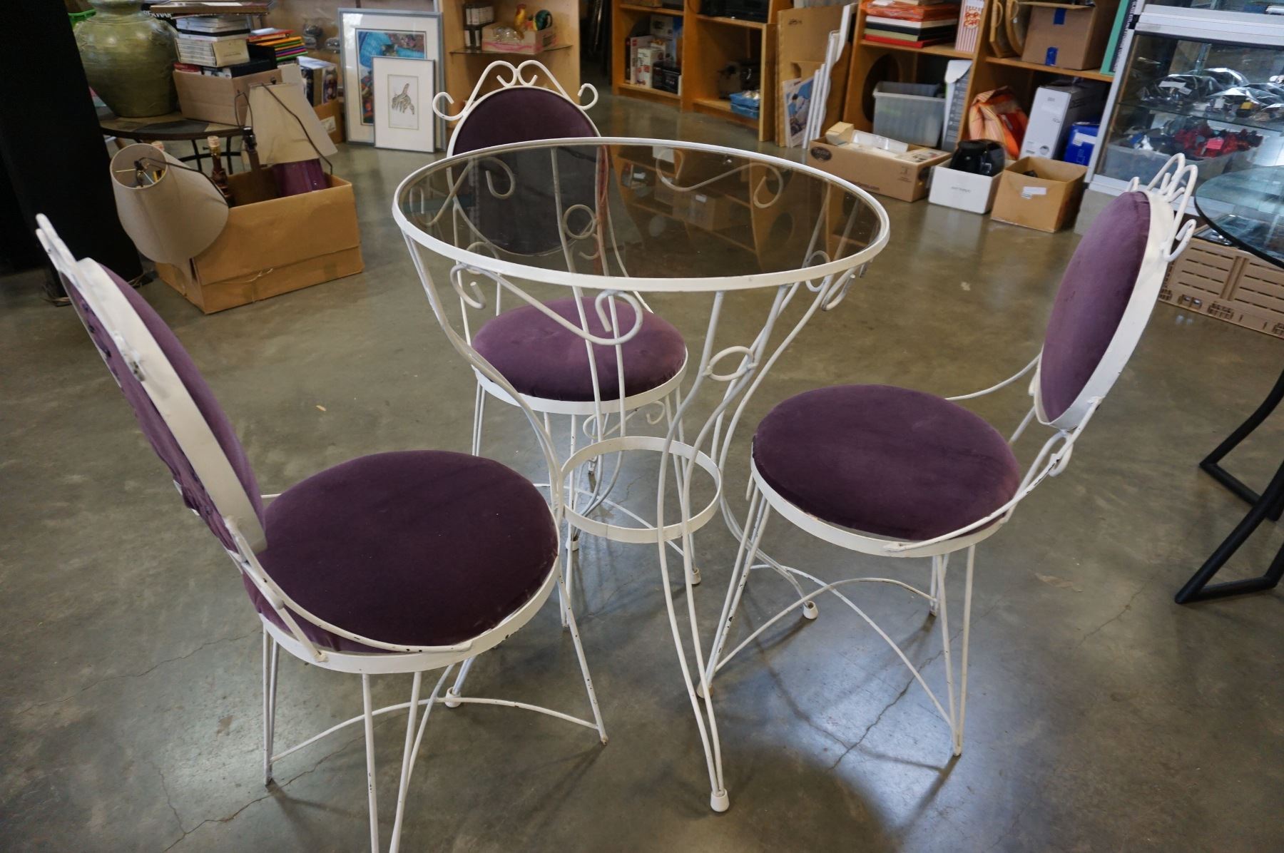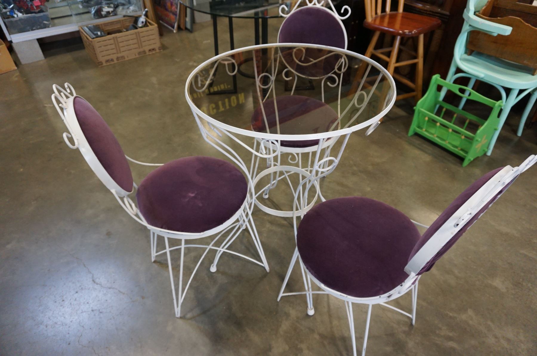 WHITE METAL GLASS TOP PATIO TABLE W/ 3 CHAIRS