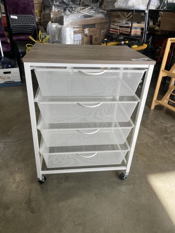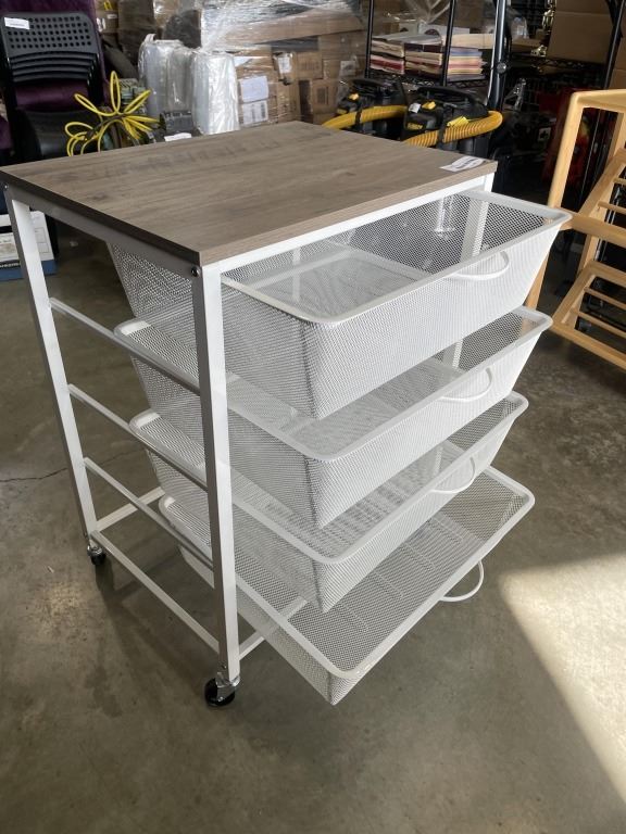 WHITE ROLLING METAL STORAGE BASKETS W/ WOOD TOP