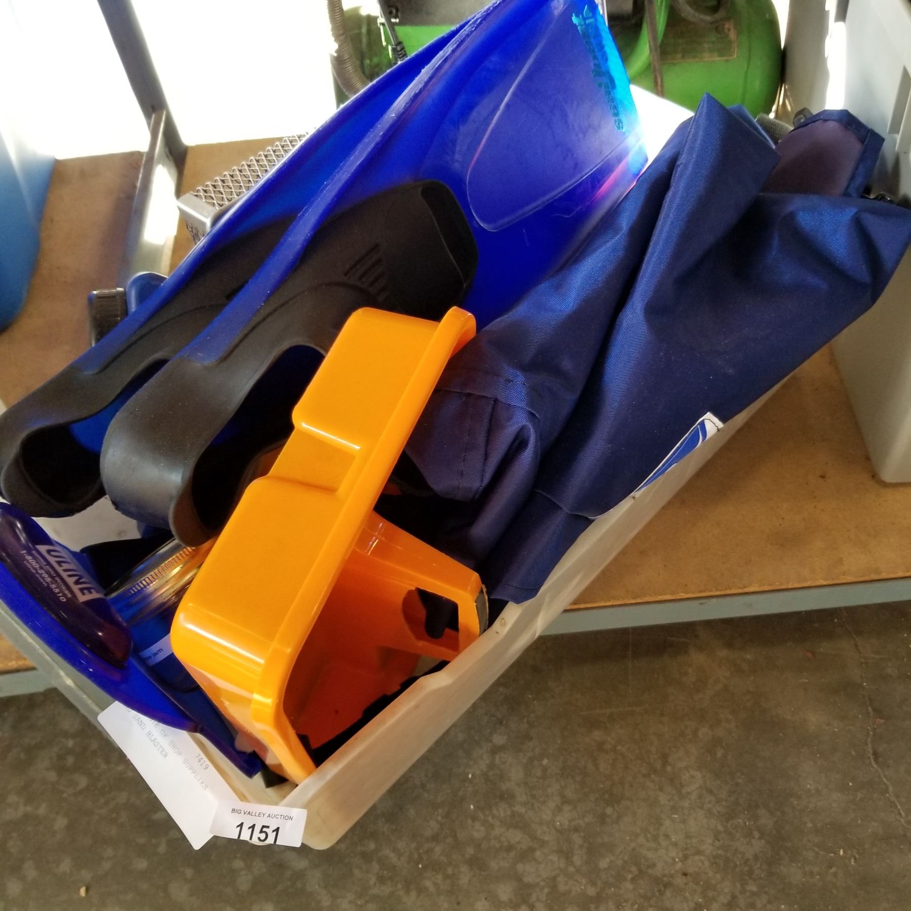 WHITE TOTE OF SHOP SUPPLIES AND SAND BLASTER