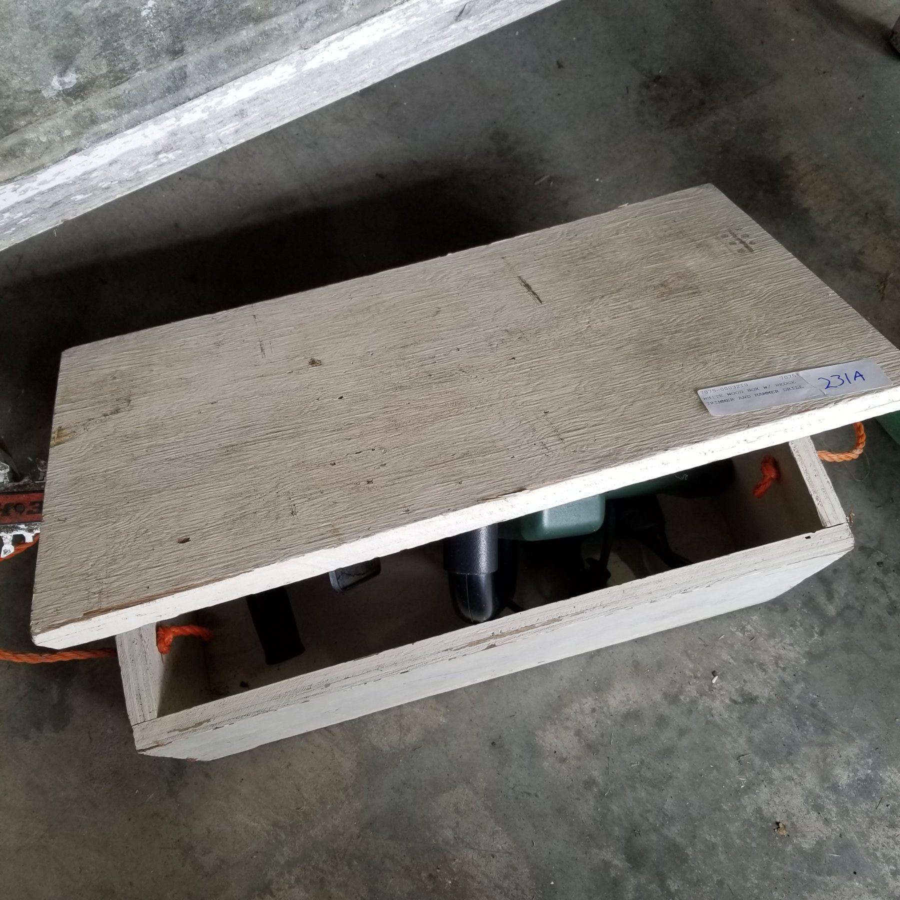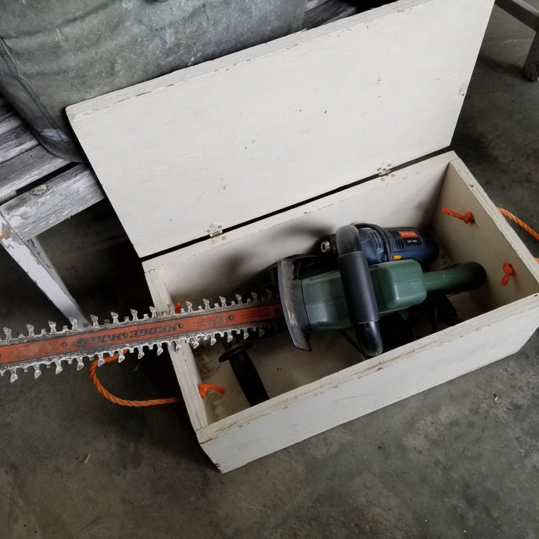 WHITE WOOD BOX W/ HEDGE TRIMMER AND HAMMER DRILL