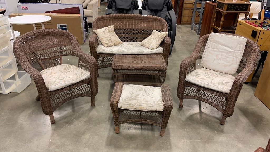 WICKER 5 PIECE PATIO SET - LOVESEAT, 2 CHAIRS, COFFEE TABLE AND FOOTSTOOL