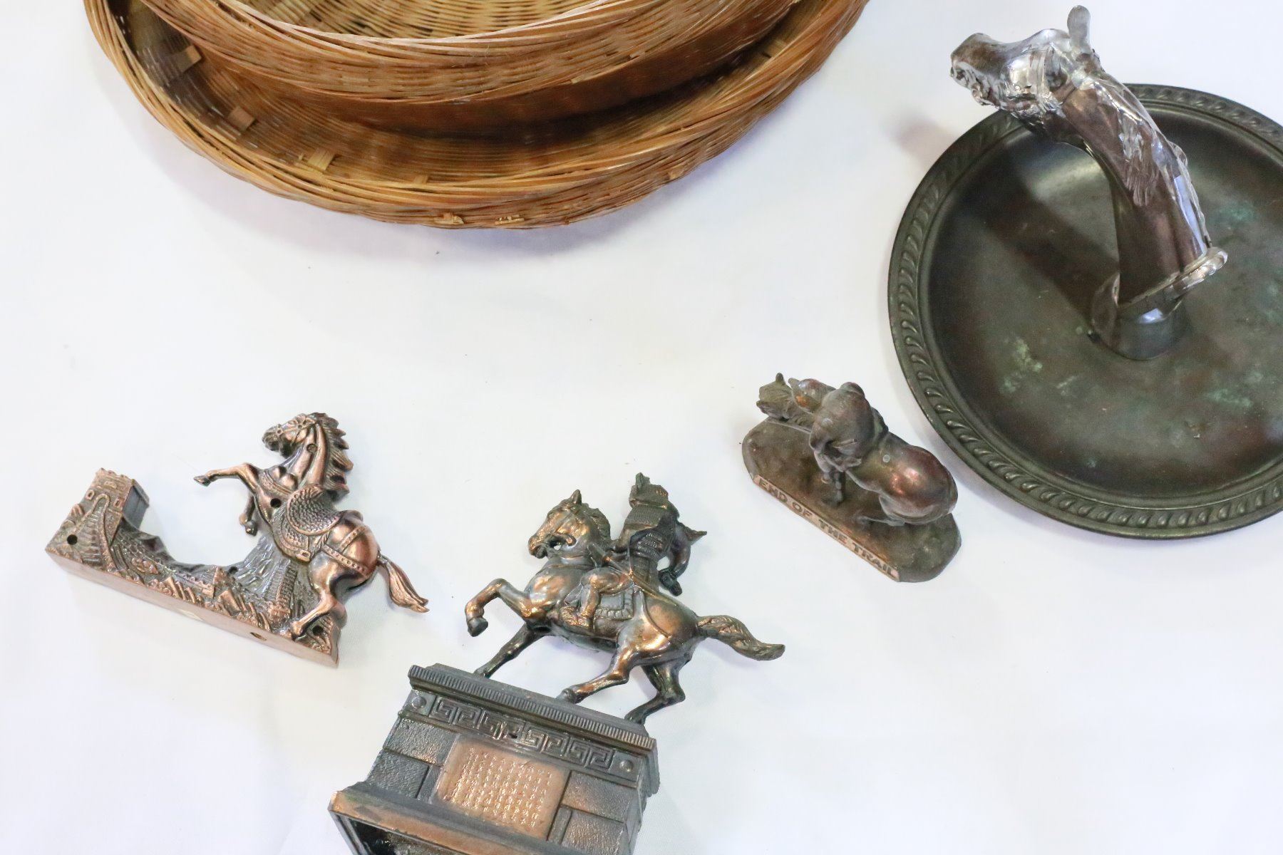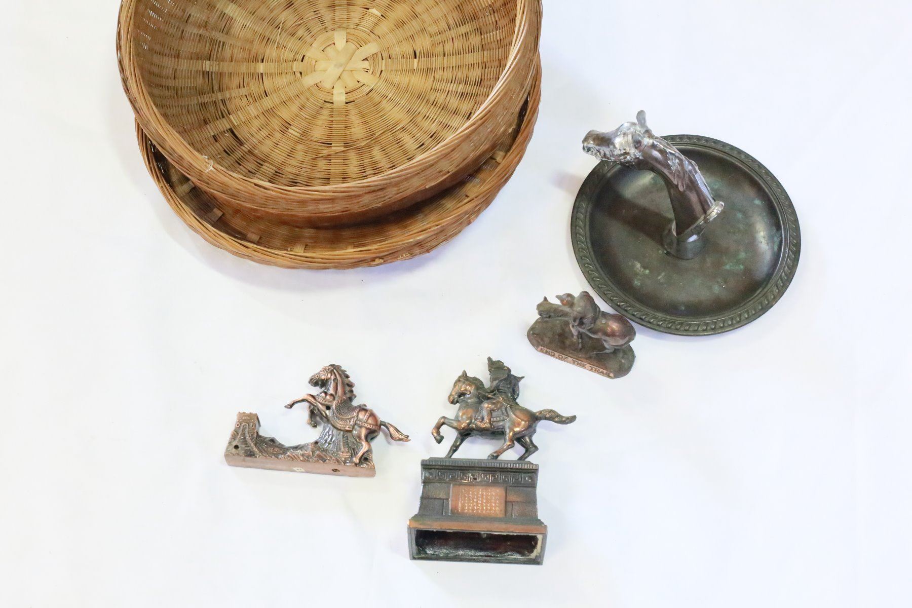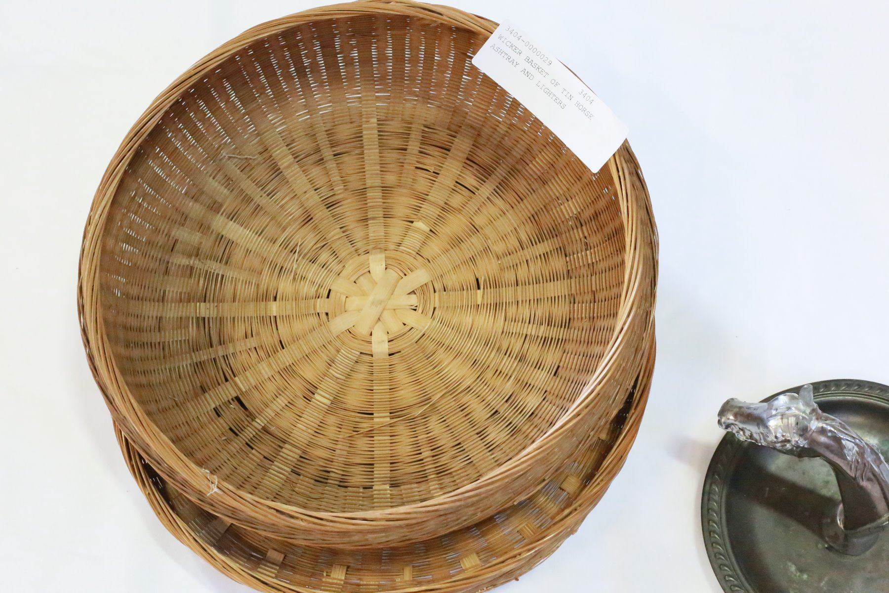 WICKER BASKET OF TIN HORSE ASHTRAY AND LIGHTERS