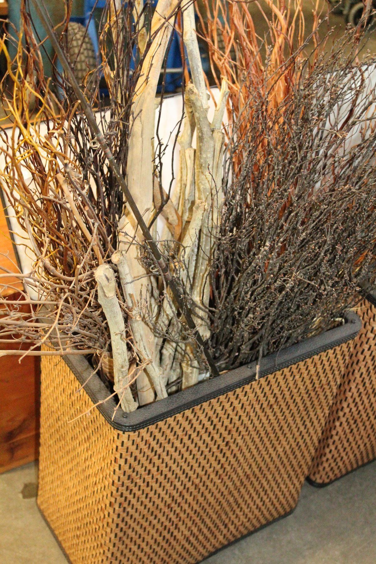 WICKER HAMPER WITH DECORATIVE WOOD STICKS
