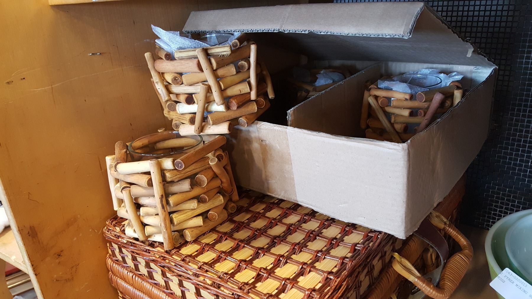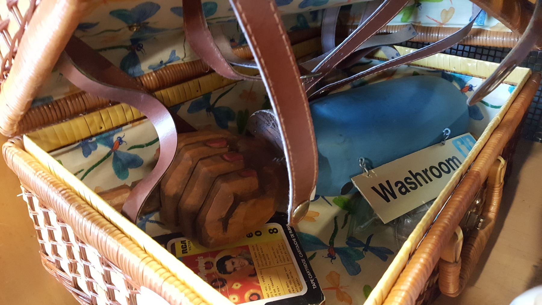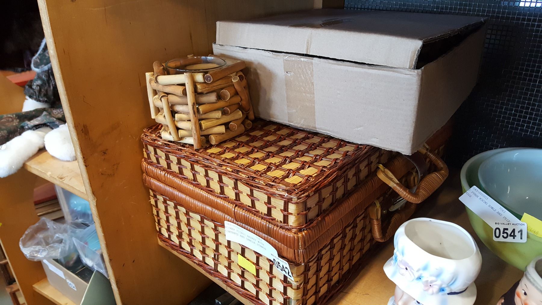 WICKER PICNIC BASKET WITH CONTENTS AND CANDLE STANDS
