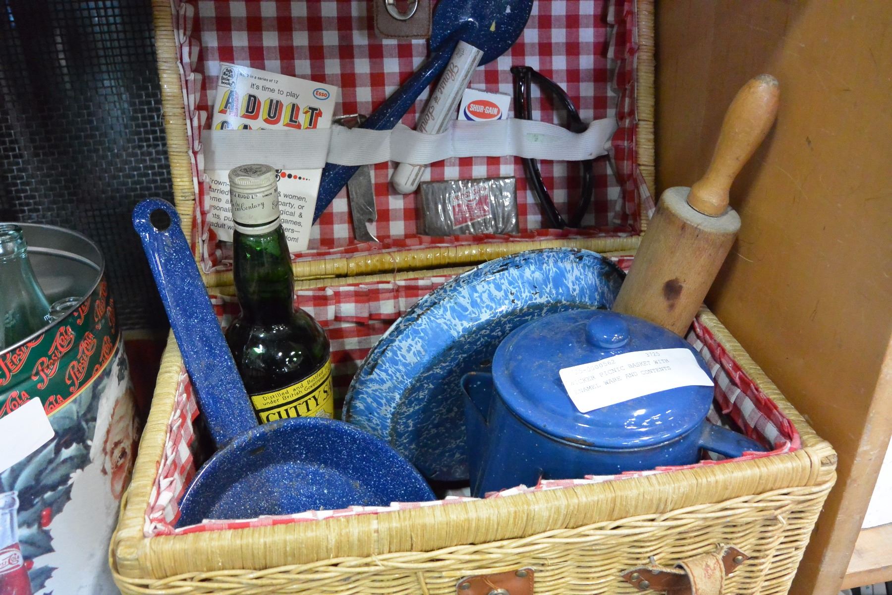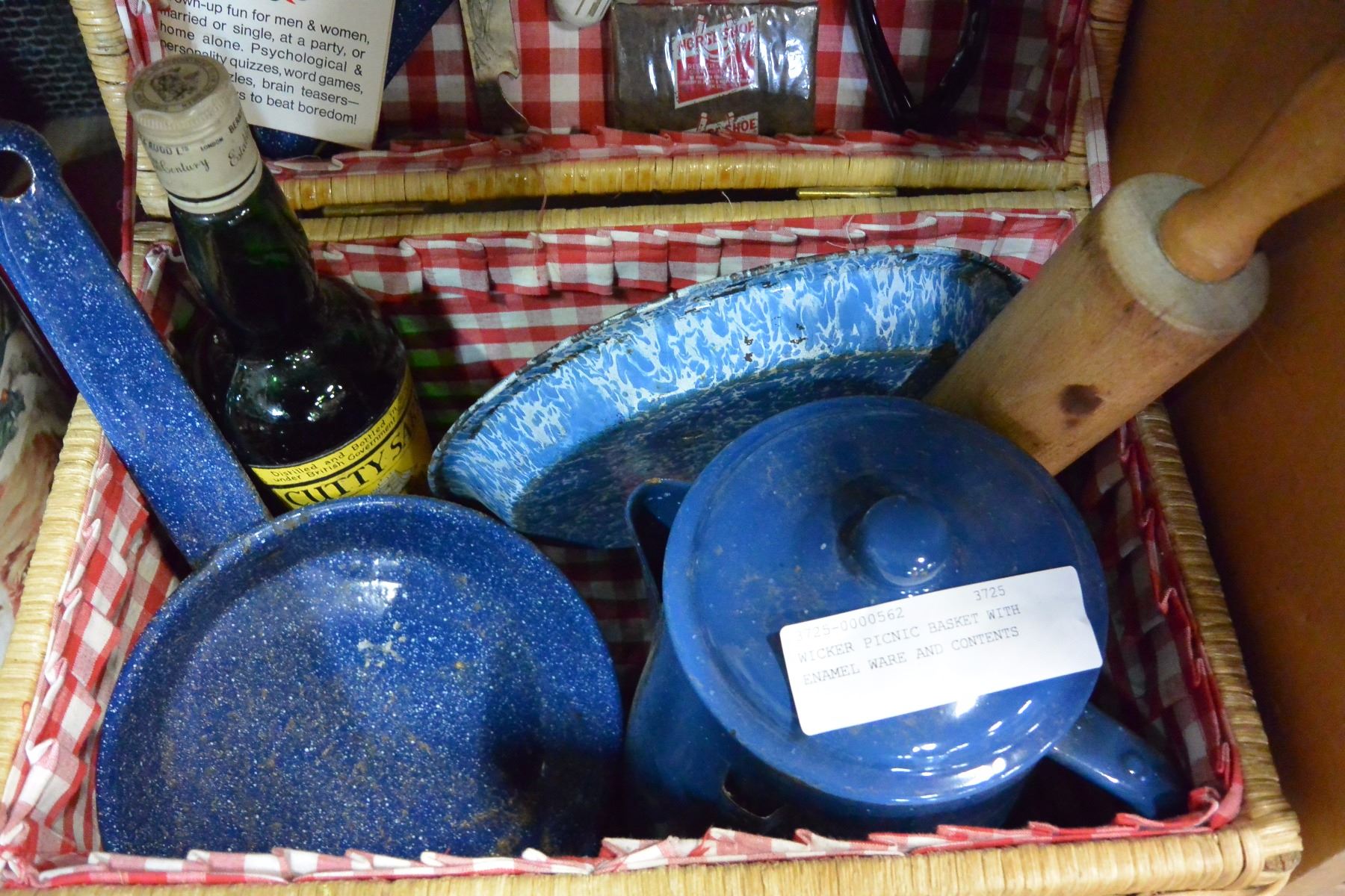 WICKER PICNIC BASKET WITH ENAMEL WARE AND CONTENTS