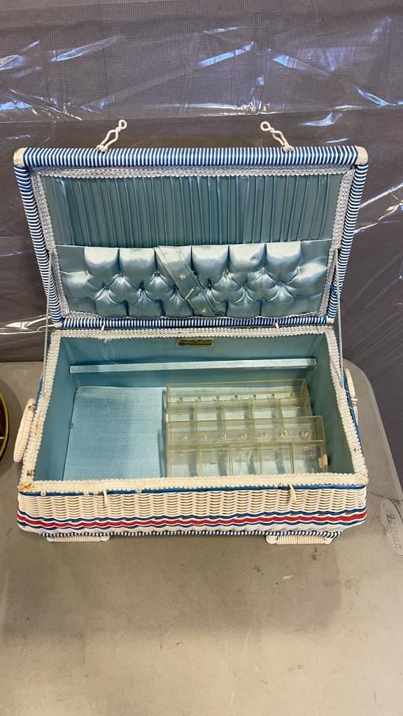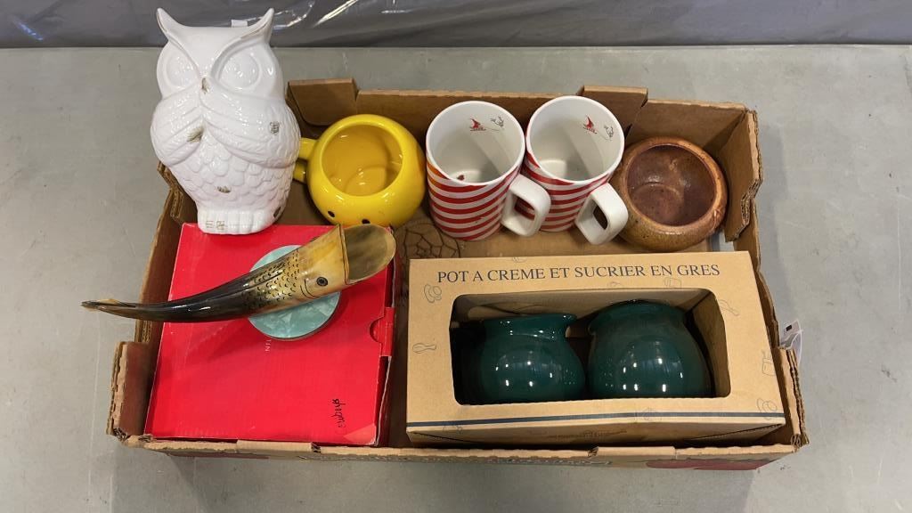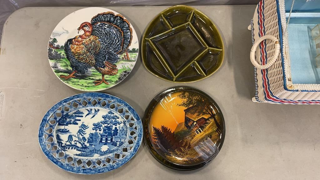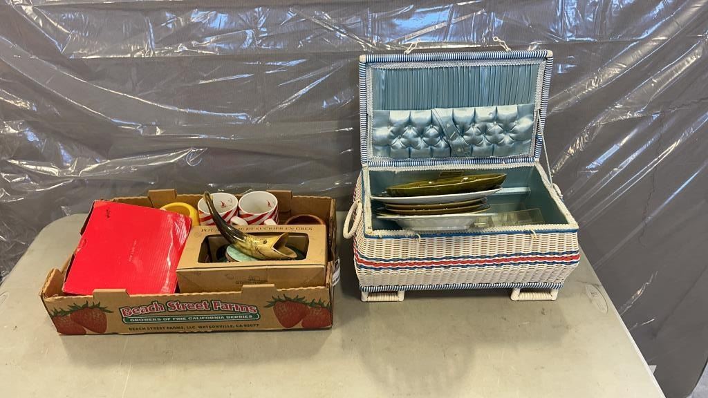 WICKER SEWING BASKET W/ CHINA PLATES, CARVED FISH IN HORN, AND TRAY OF COFFEE MUGS