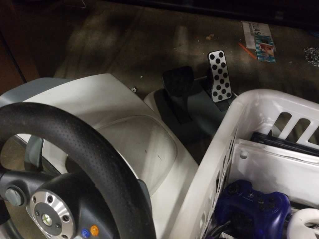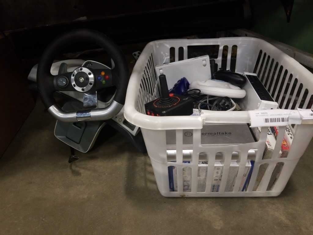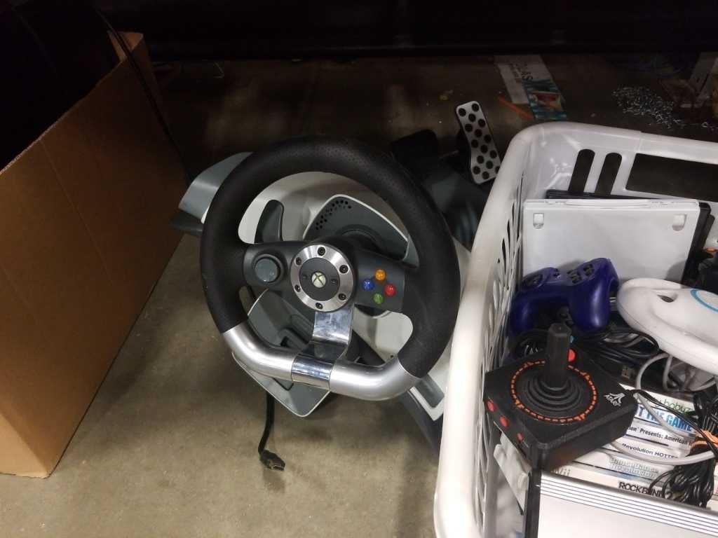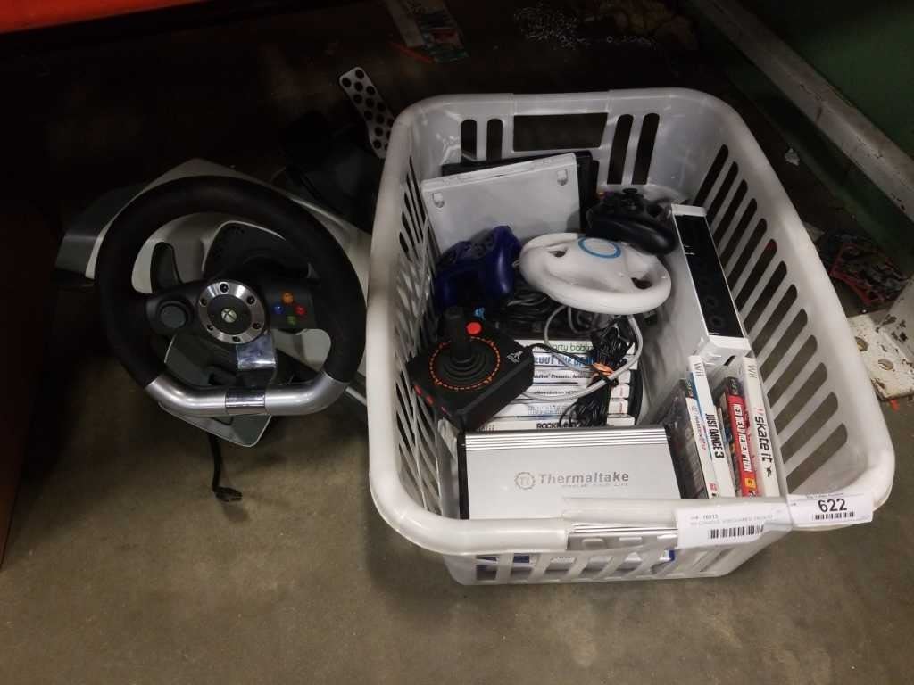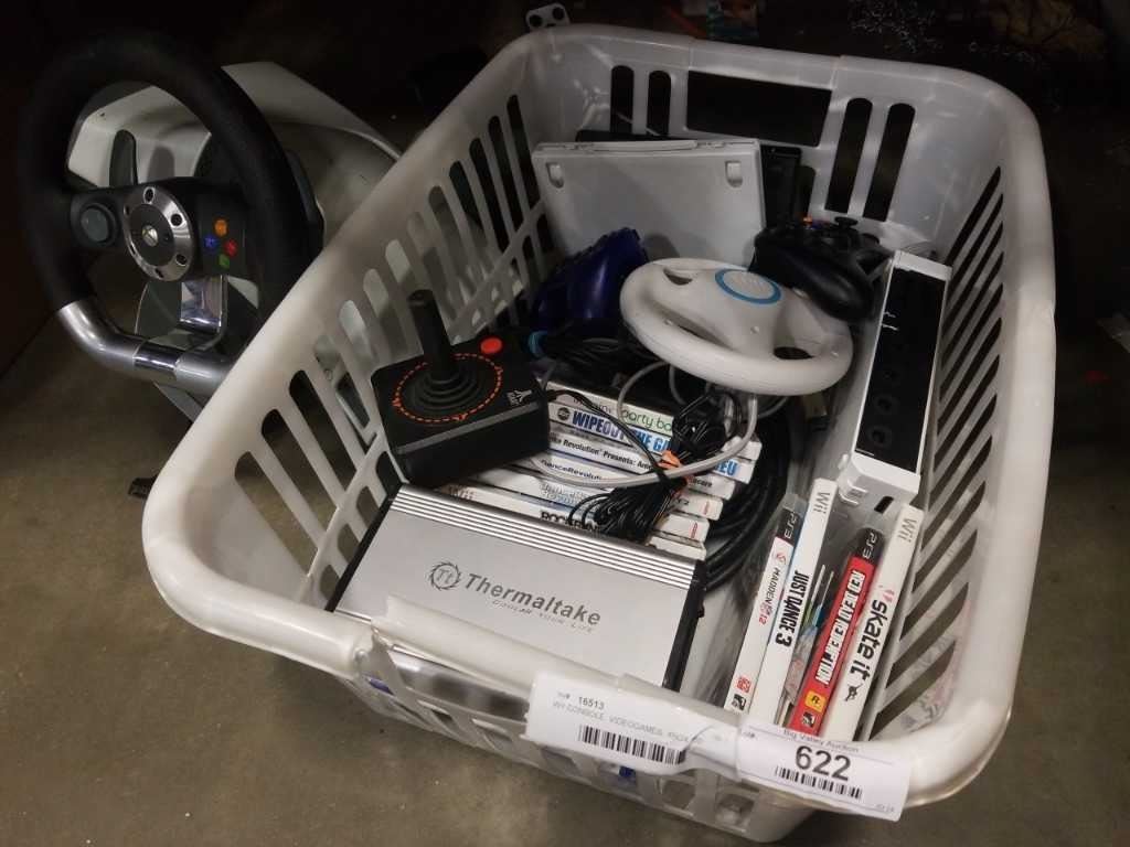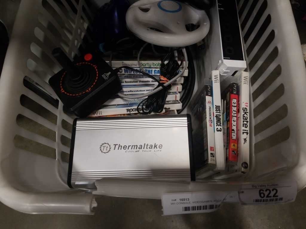 WII CONSOLE, VIDEOGAMES, XBOX 360 CONTROLLER AND STEERING WHEEL WITH PEDALS