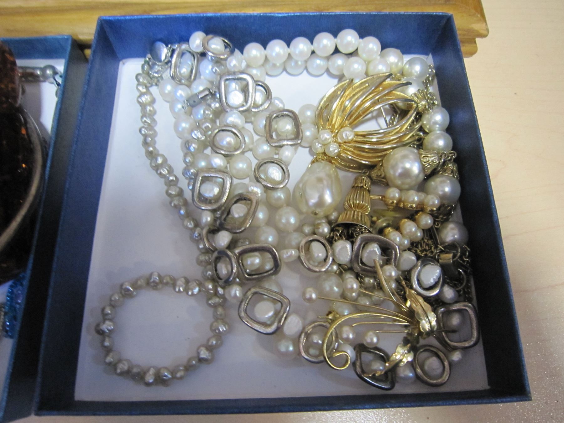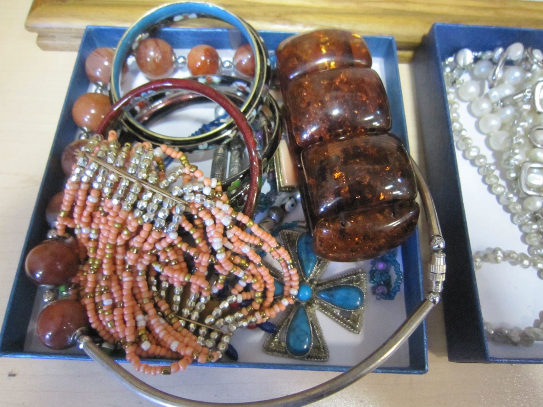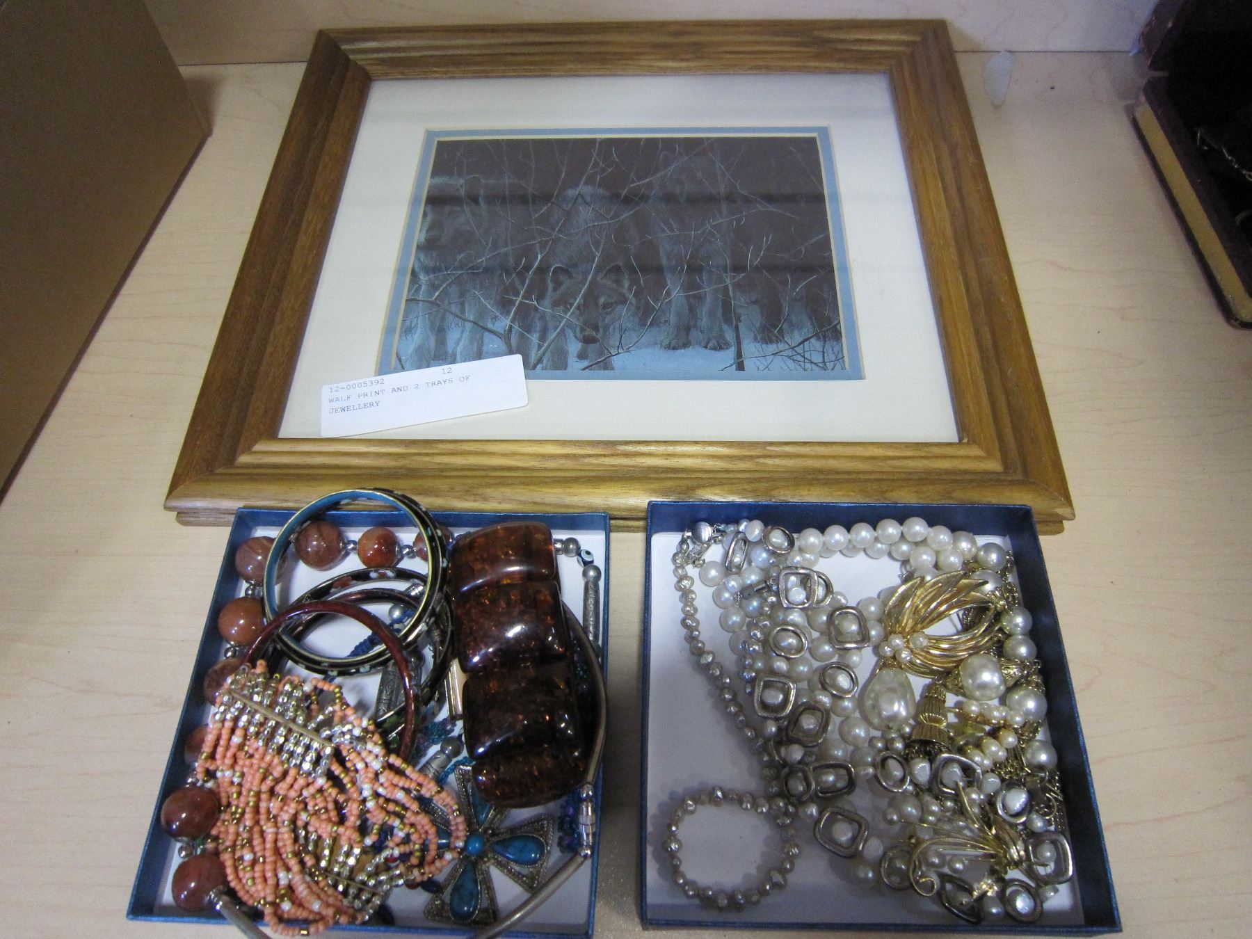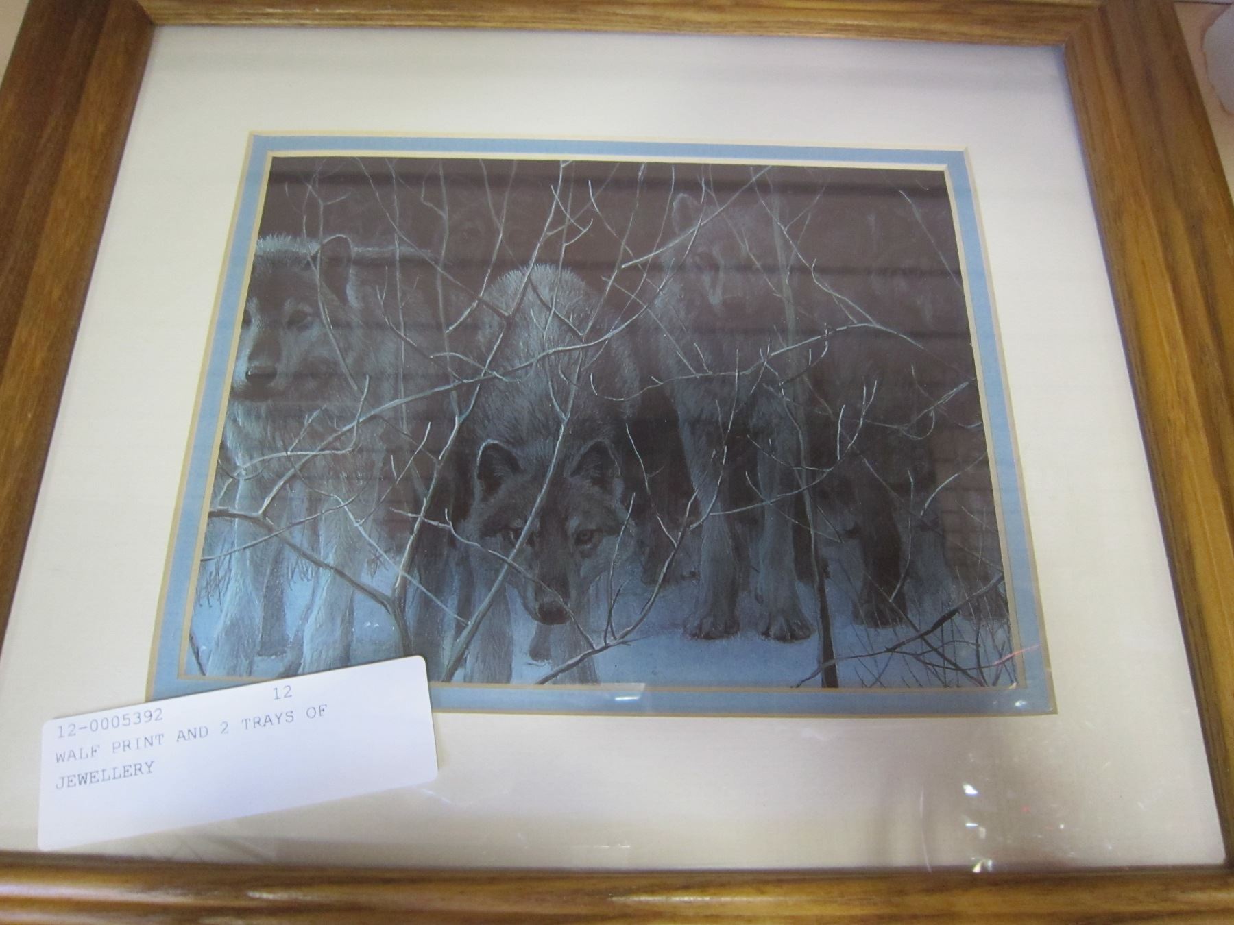 WOLF PRINT AND 2 TRAYS OF JEWELLERY