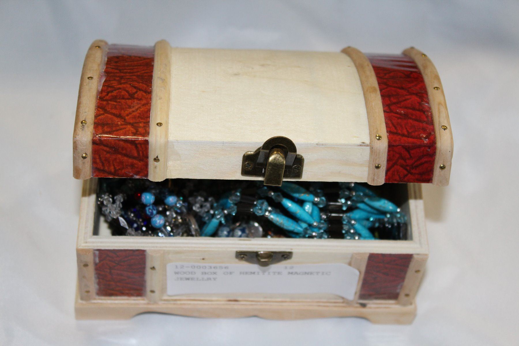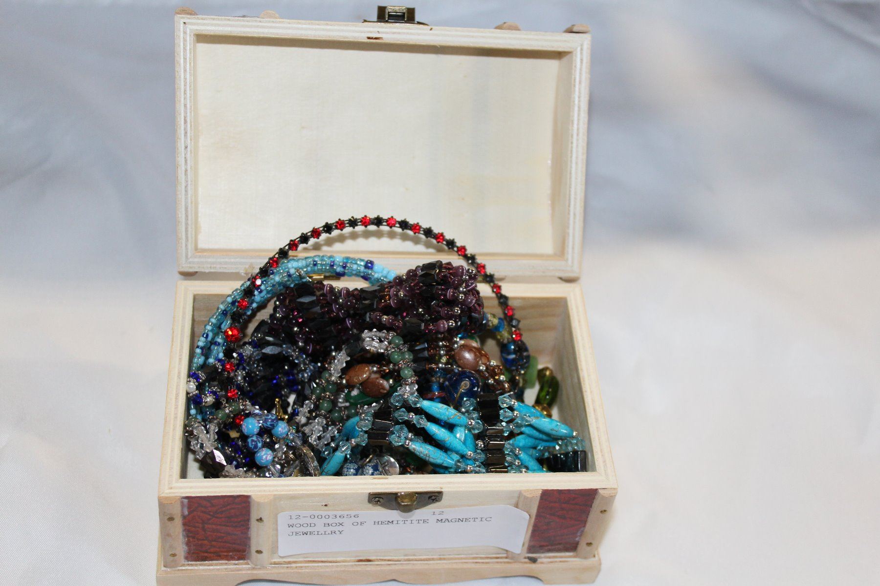 WOOD BOX OF HEMITITE MAGNETIC JEWELLRY