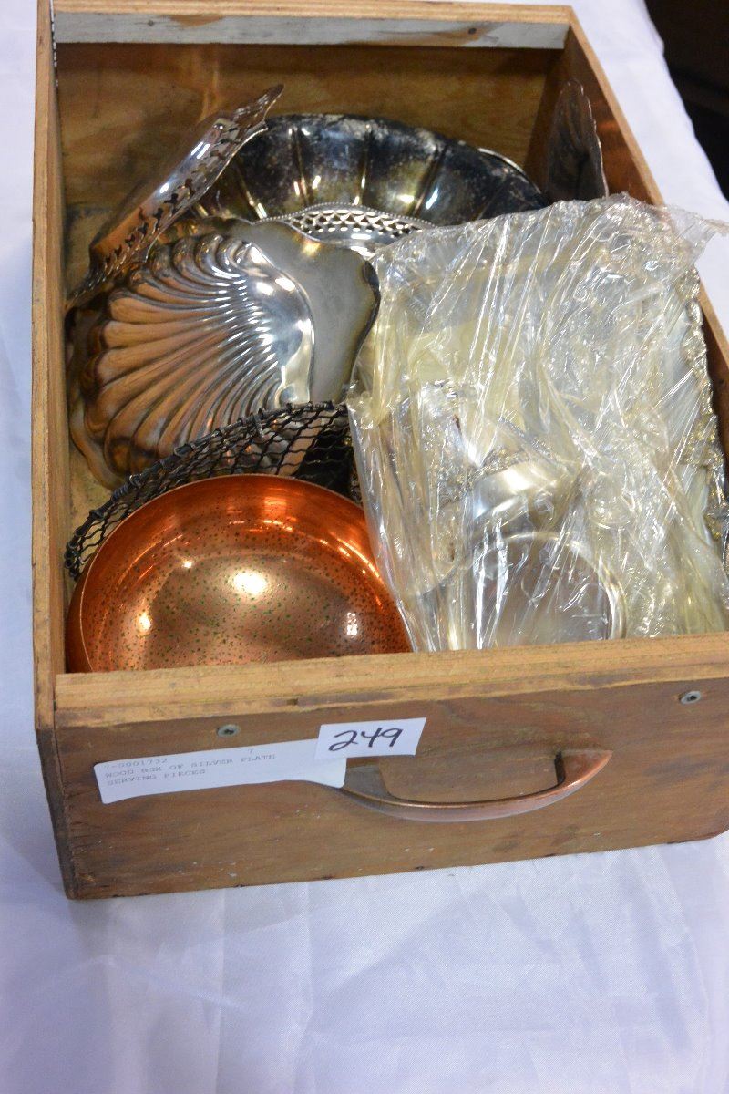WOOD BOX OF SILVER PLATE SERVING PIECES