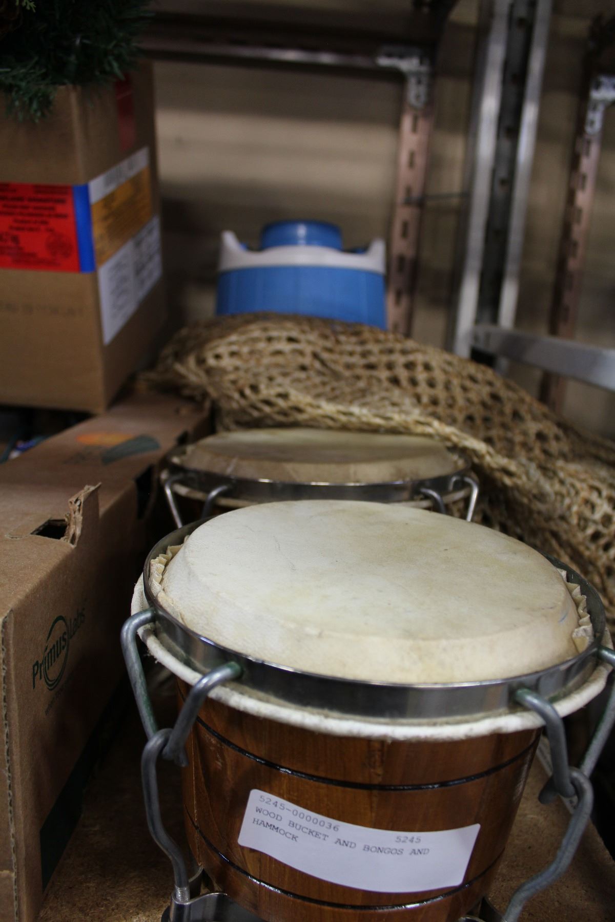 WOOD BUCKET AND BONGOS AND HAMMOCK