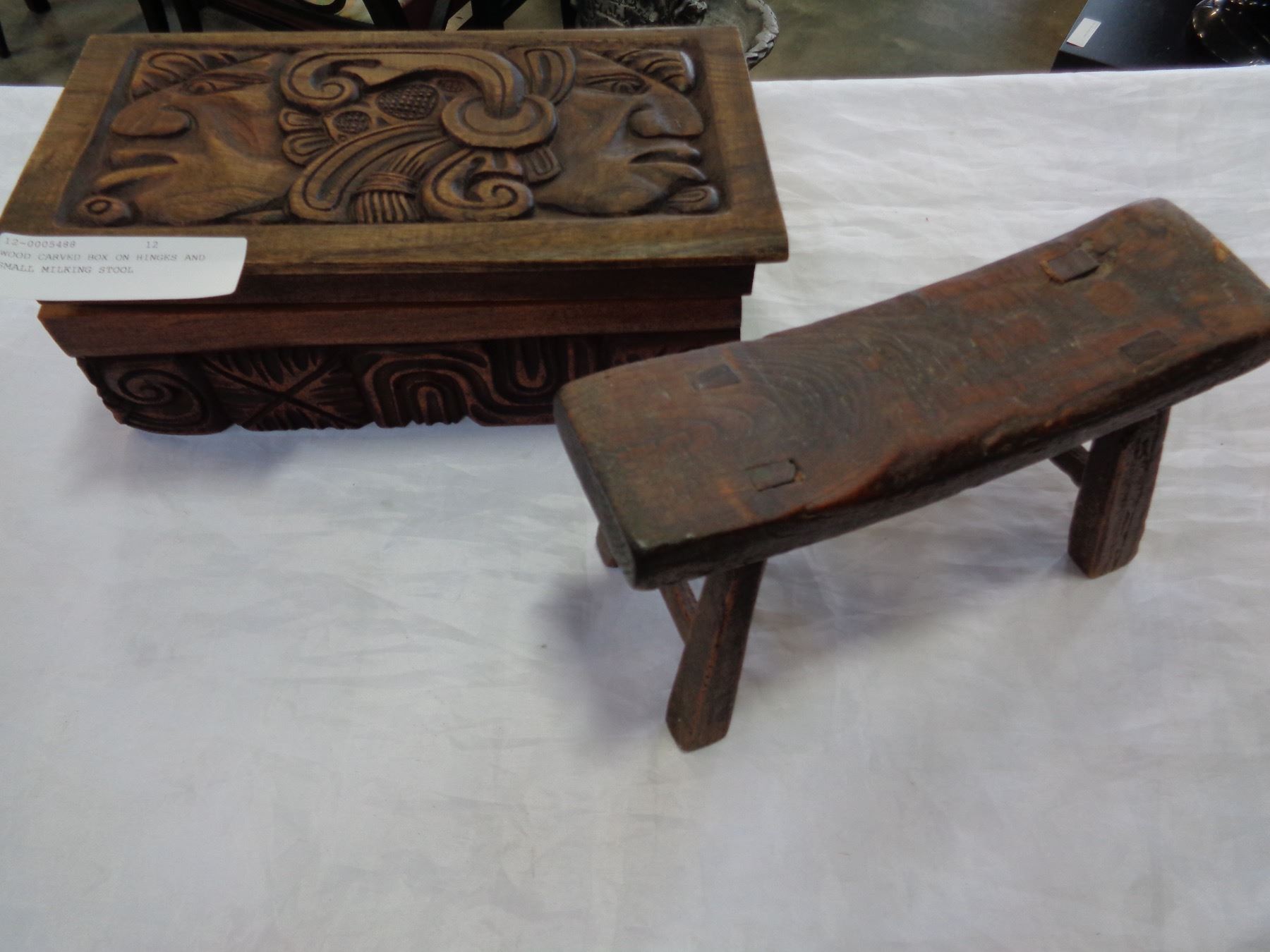 WOOD CARVED BOX ON HINGES AND SMALL MILKING STOOL