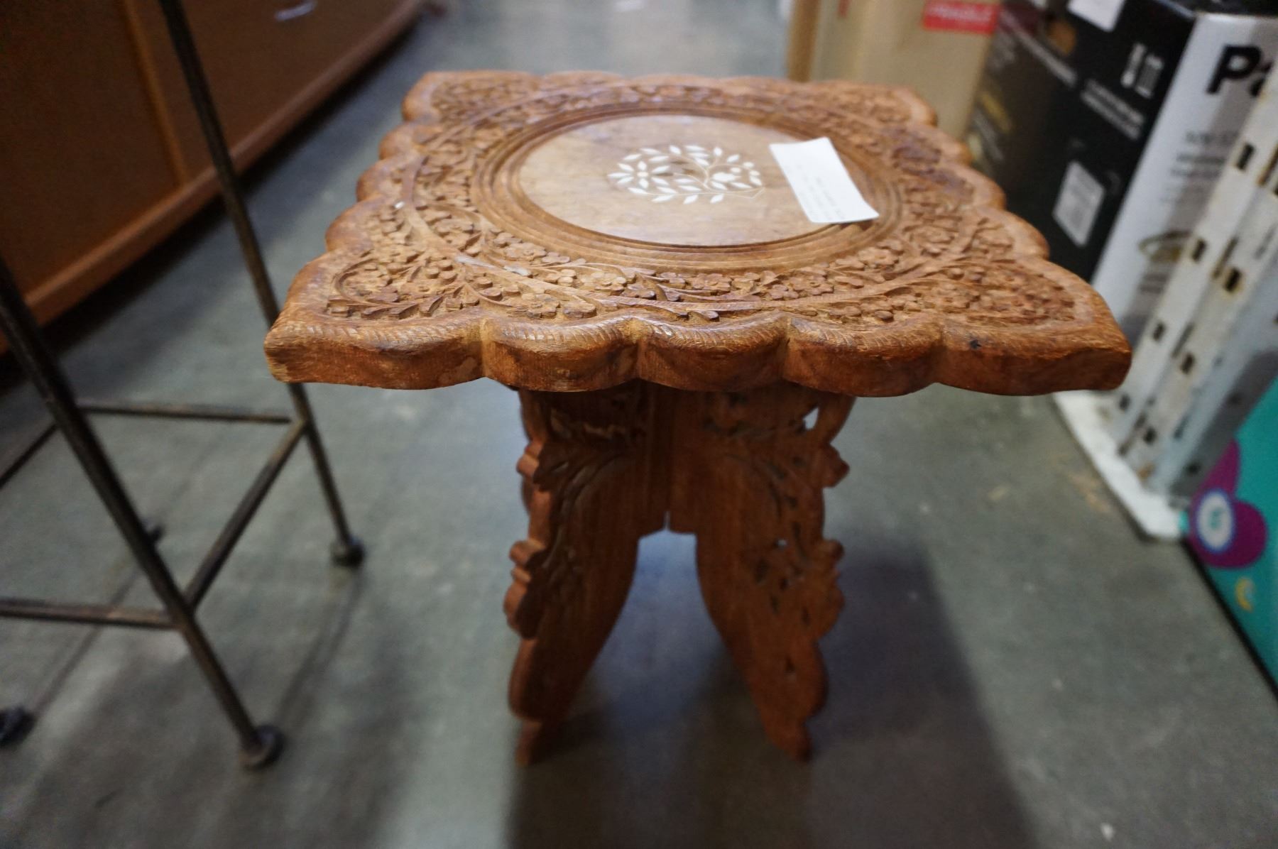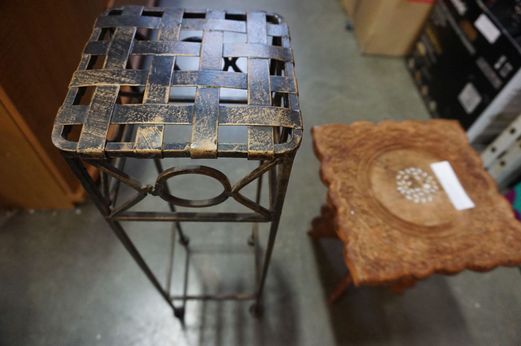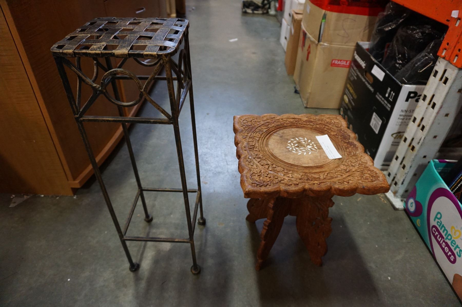 WOOD CARVED END TABLE AND METAL PLANTER STAND