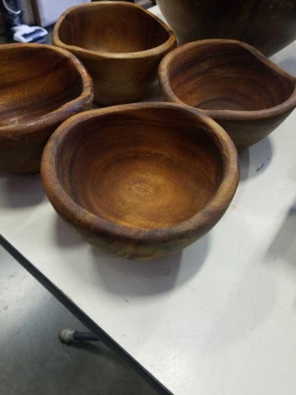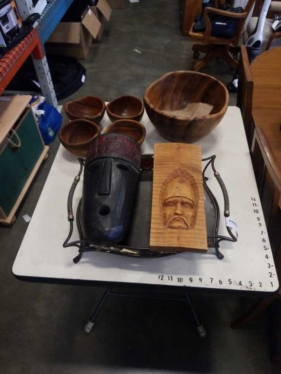 WOOD CARVINGS, BOWL SET, MASK AND DECORATIVE TRAY