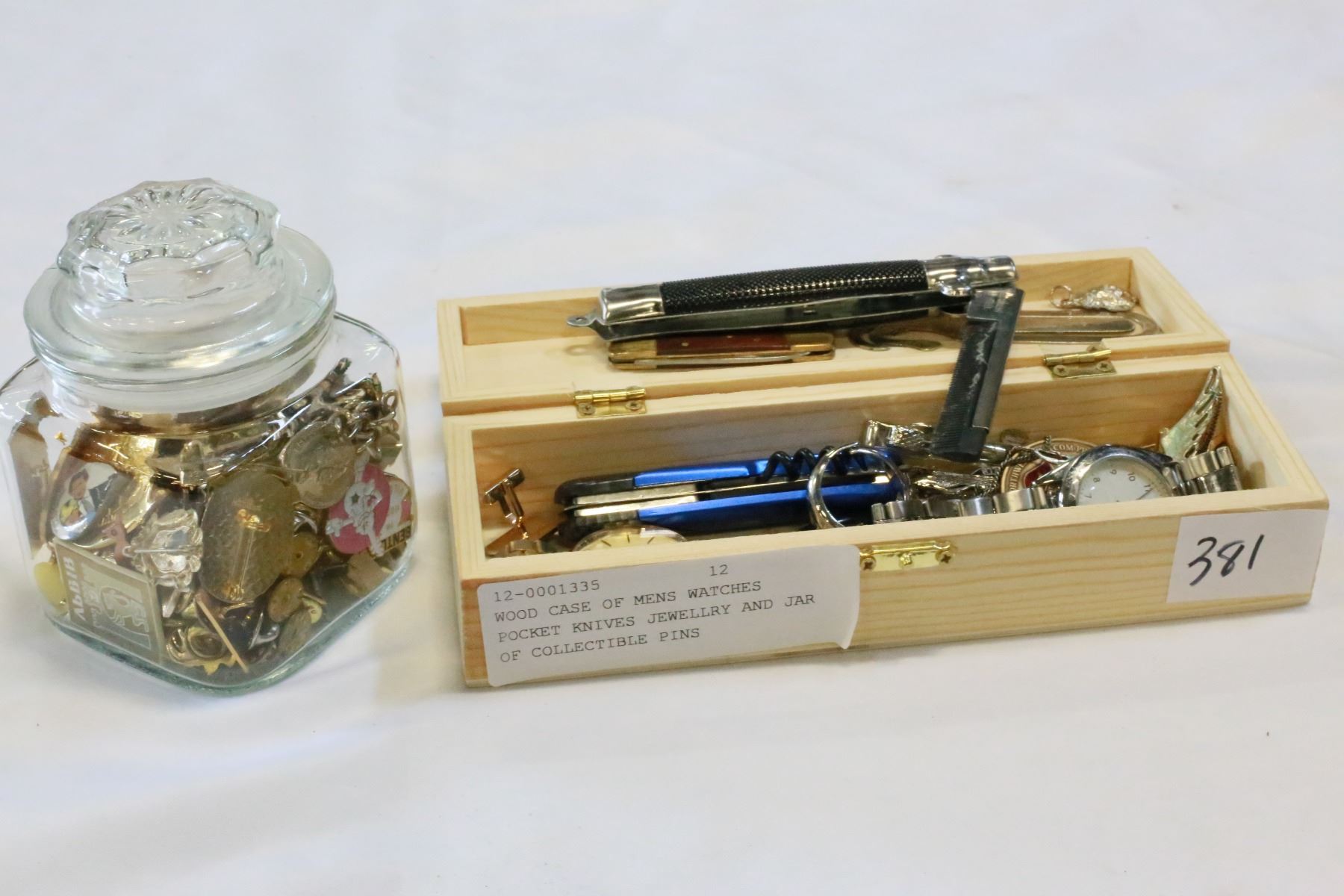 WOOD CASE OF MENS WATCHES POCKET KNIVES JEWELLRY AND JAR OF COLLECTIBLE PINS
