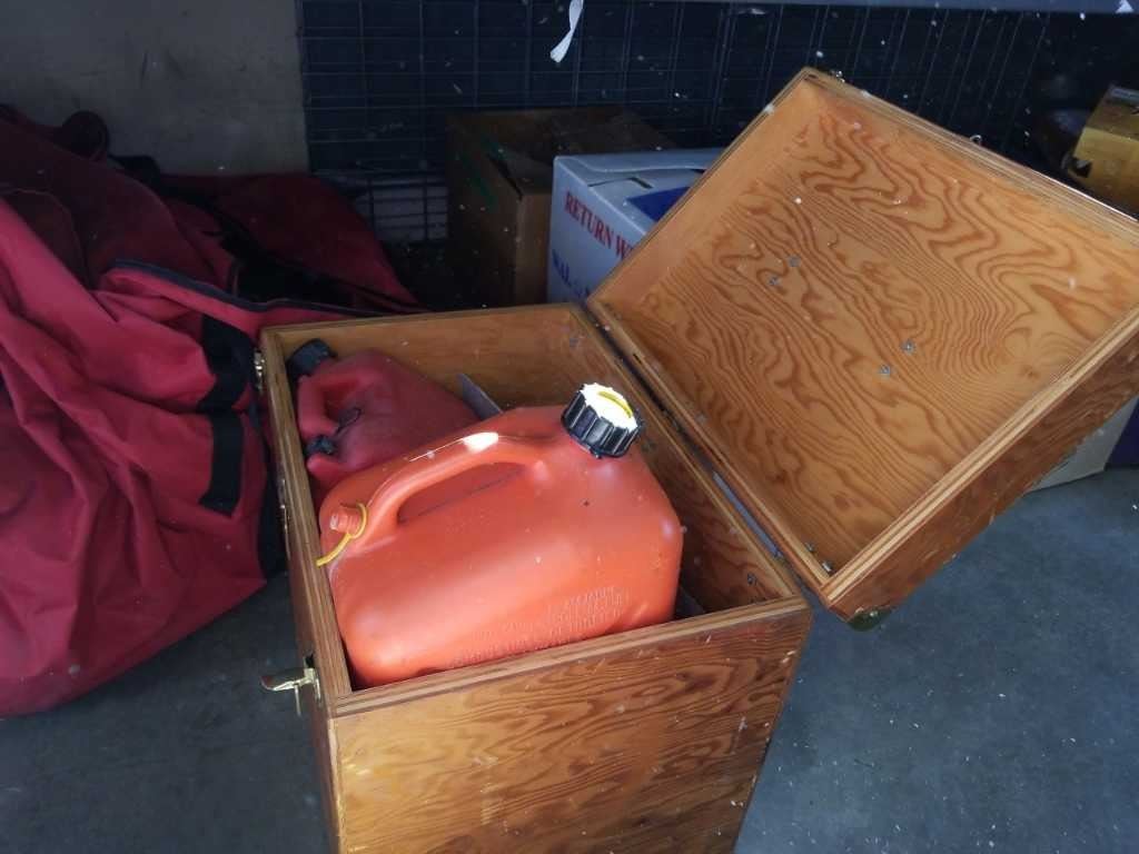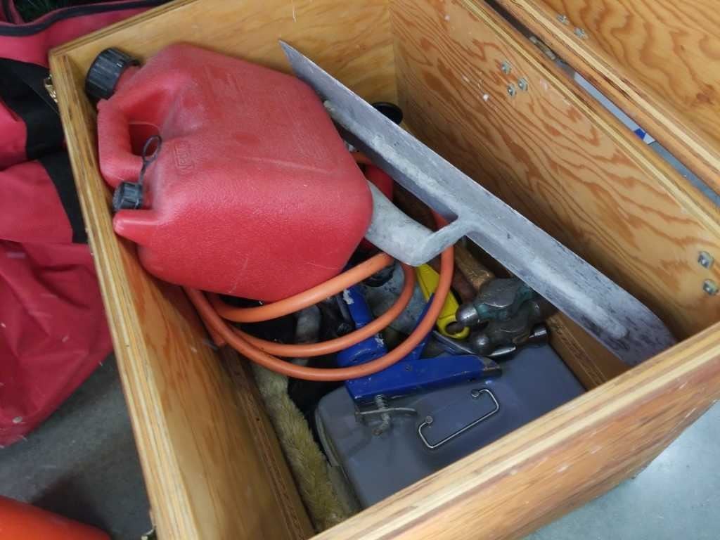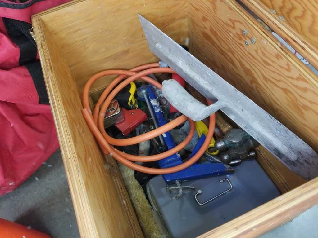 WOOD CHEST OF TROWLING AND OTHER TOOLS