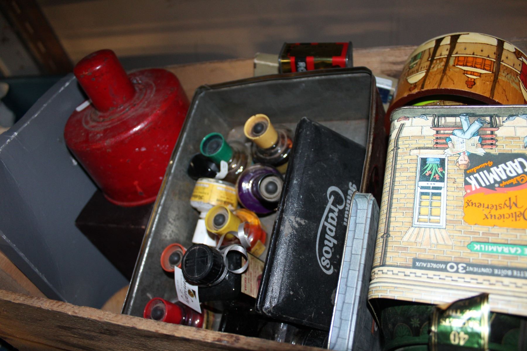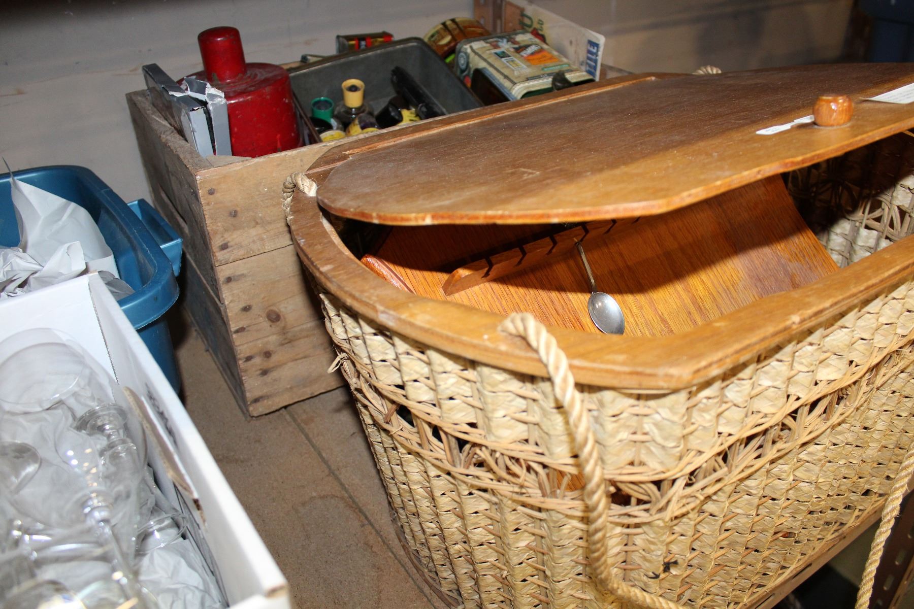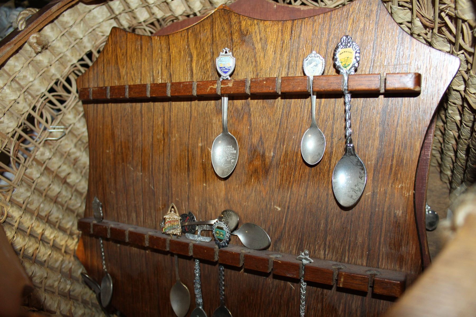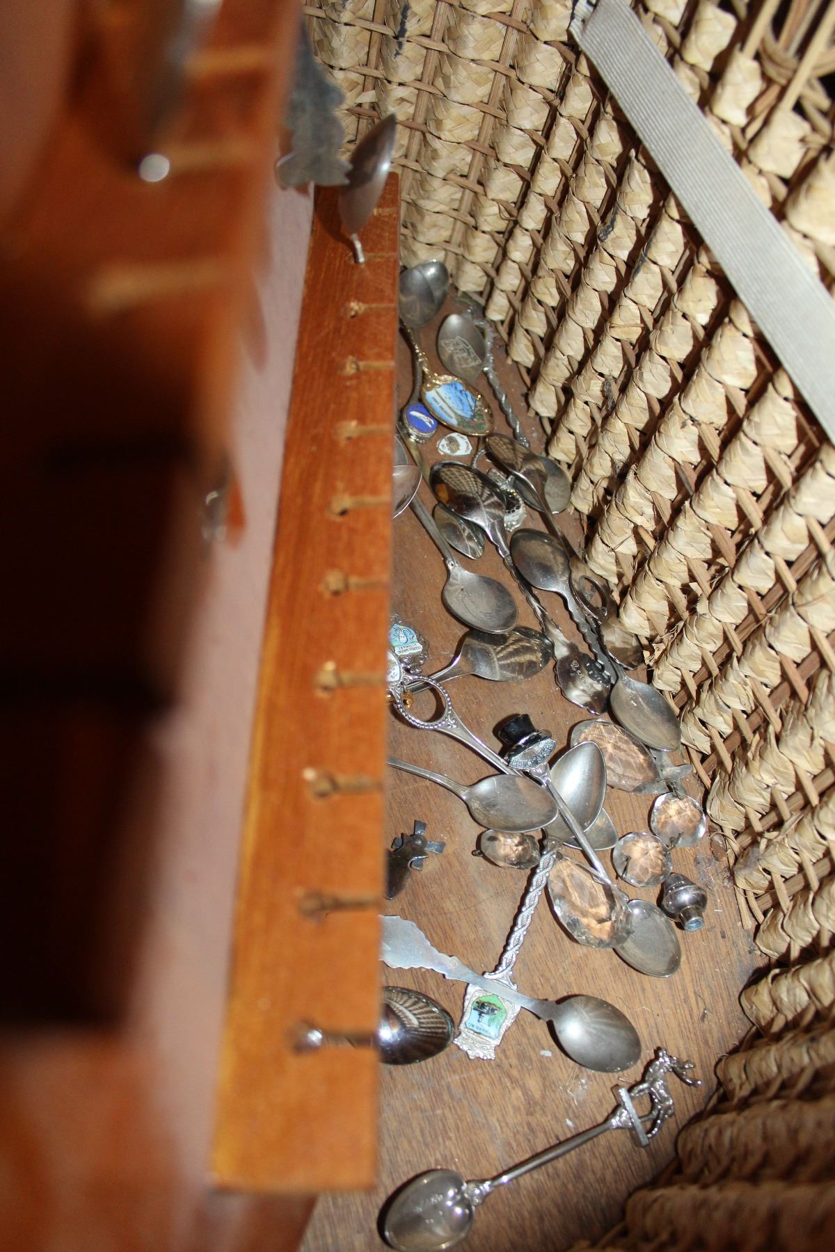 WOOD CRATE OF COLLECTIBLES AND VINTAGE BASKET WITH SPOON RACKS AND SPOONS