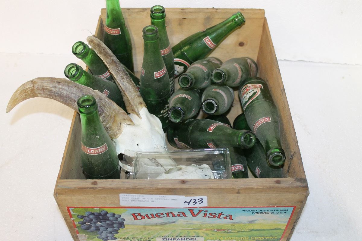 WOOD CRATE OF OLD BOTTTLES AND GOAT AND BEAVER SKULL