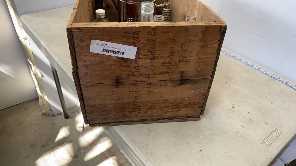 WOOD CRATE OF VINTAGE BOTTLES