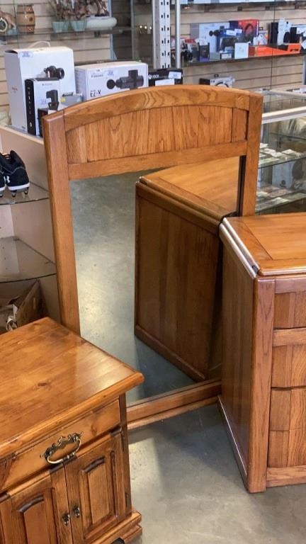 WOOD DRESSER WITH MIRROR AND PAIR OF NIGHTSTANDS