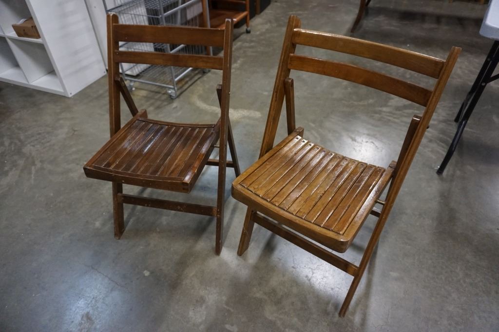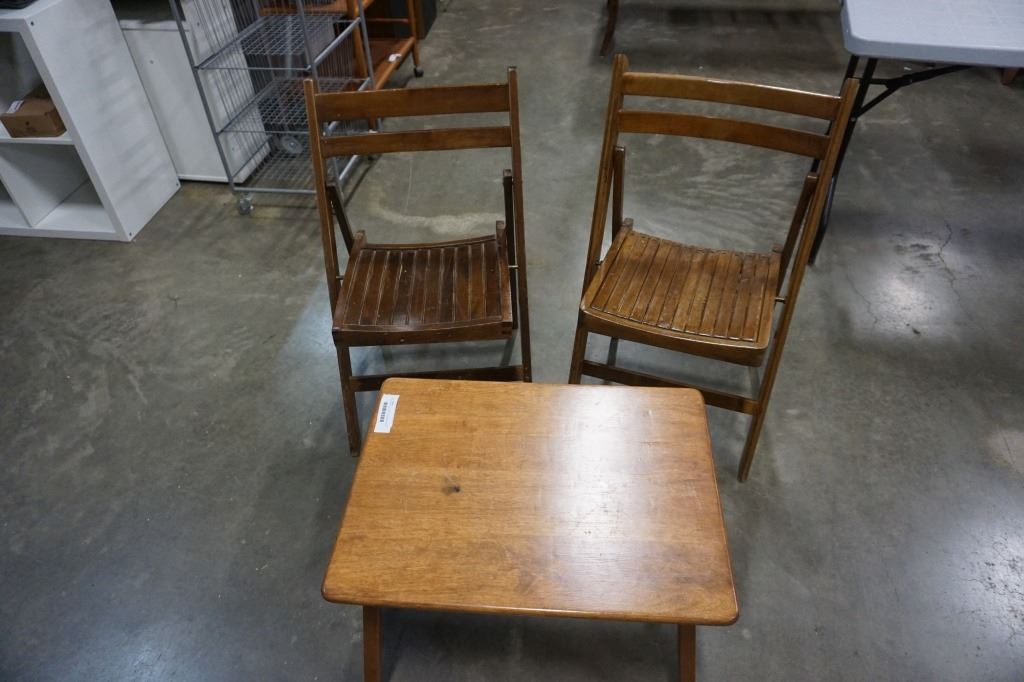 WOOD ENDTABLE AND 2 FOLDING WOOD CHAIRS