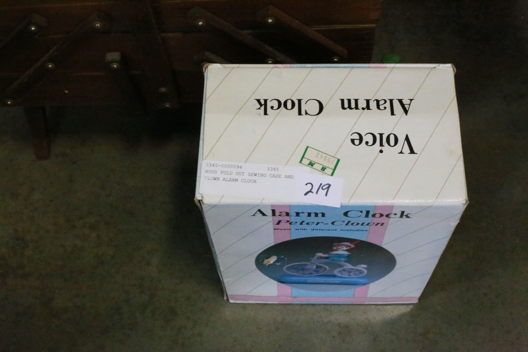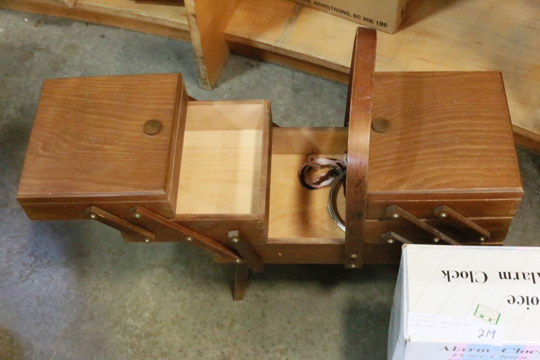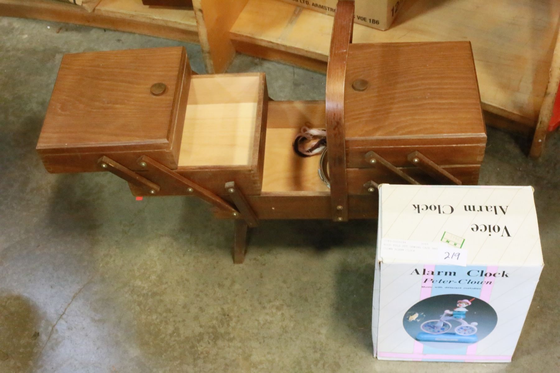 WOOD FOLD OUT SEWING CASE AND CLOWN ALARM CLOCK