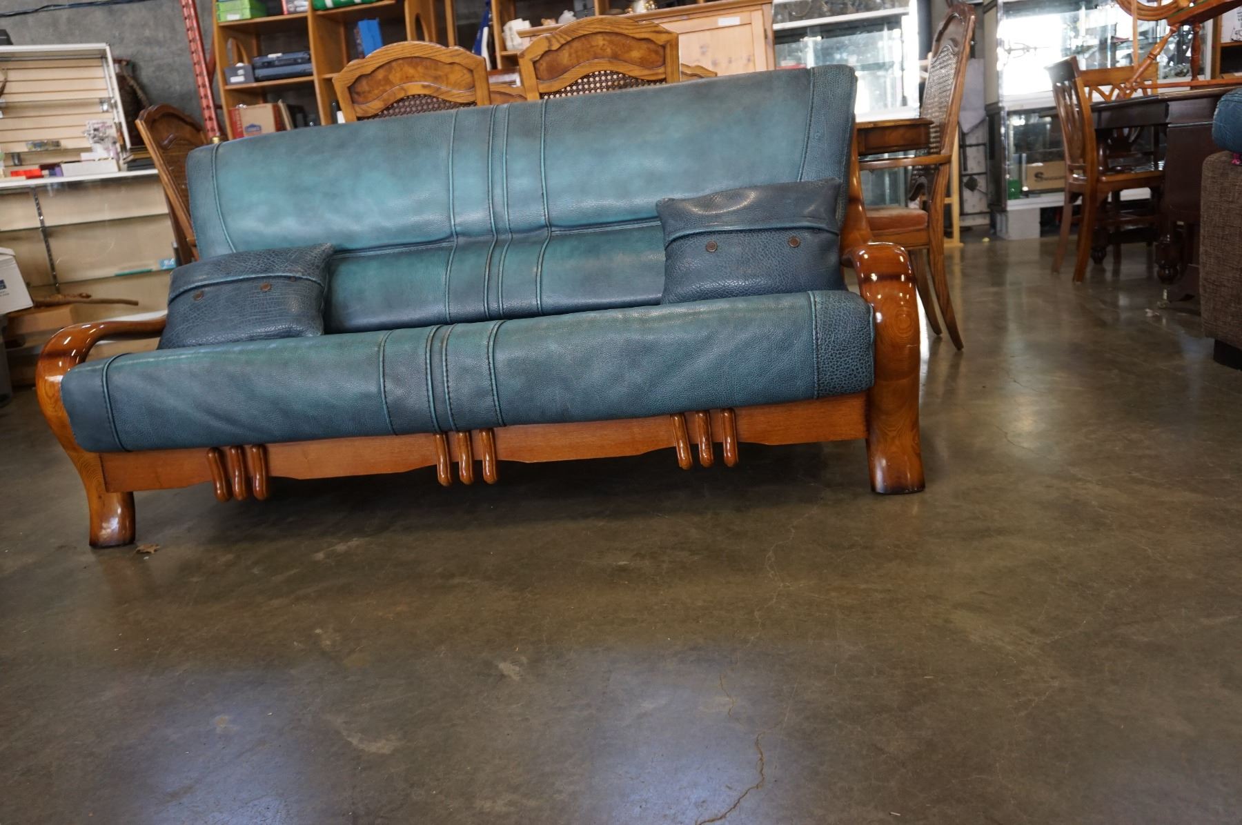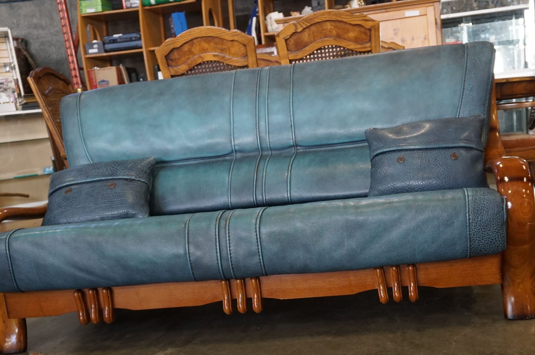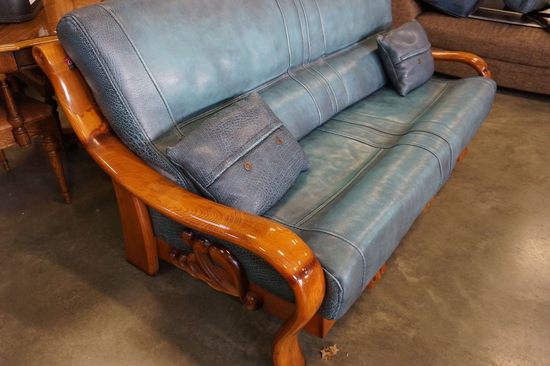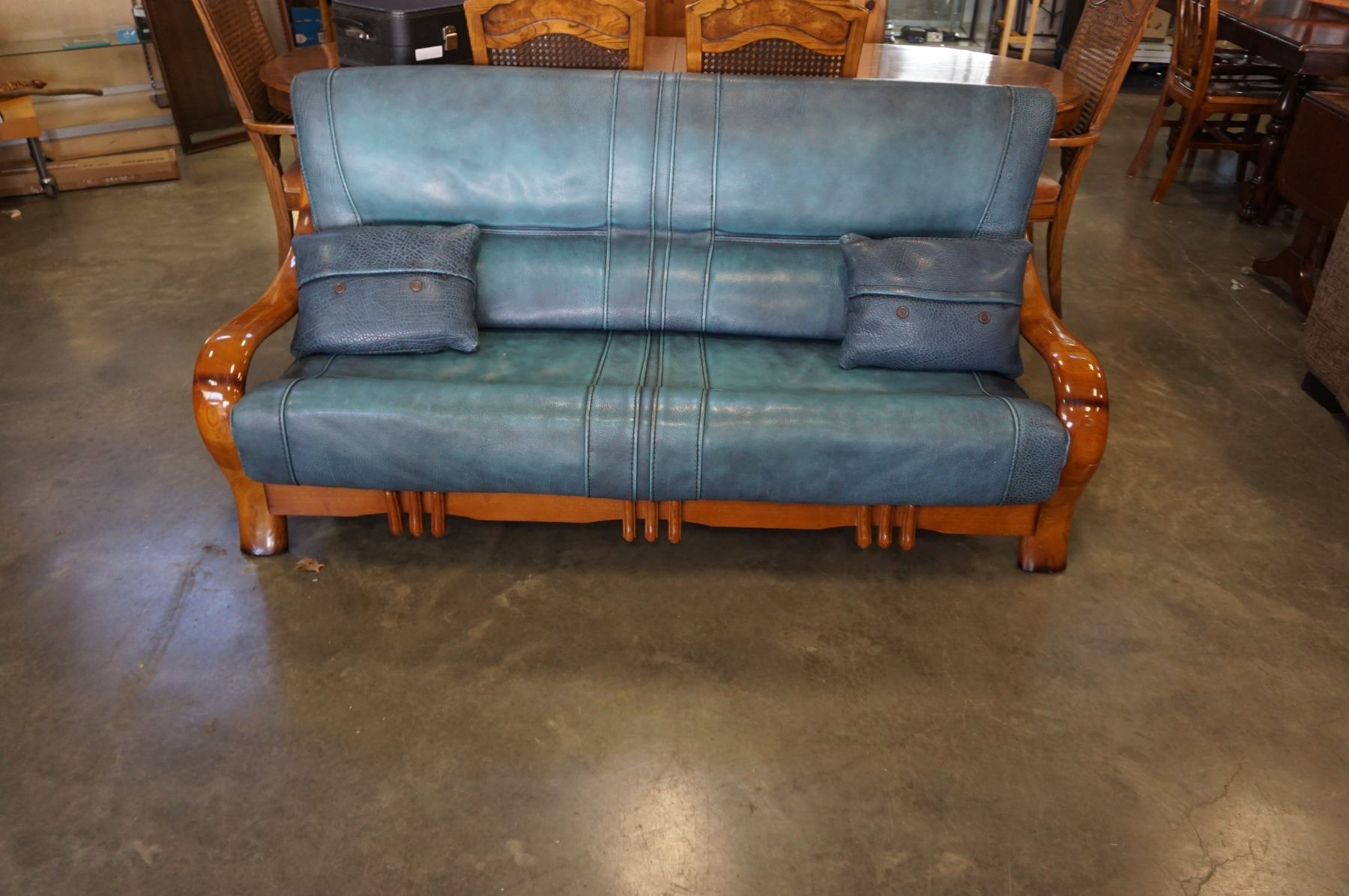 WOOD FRAMED SOFA AND CHAIR W/ TEAL BUFFALO HIDE CUSHIONS AND THROW PILLOWS