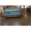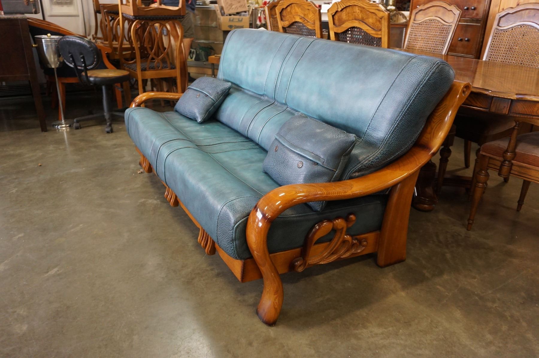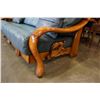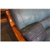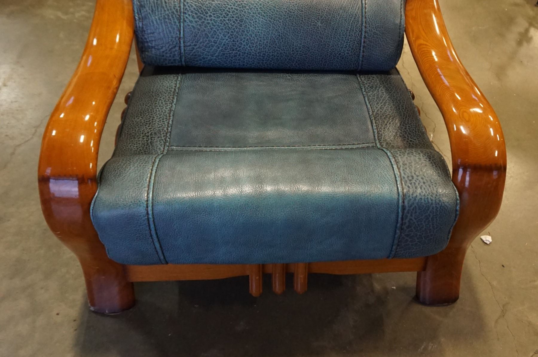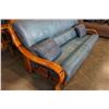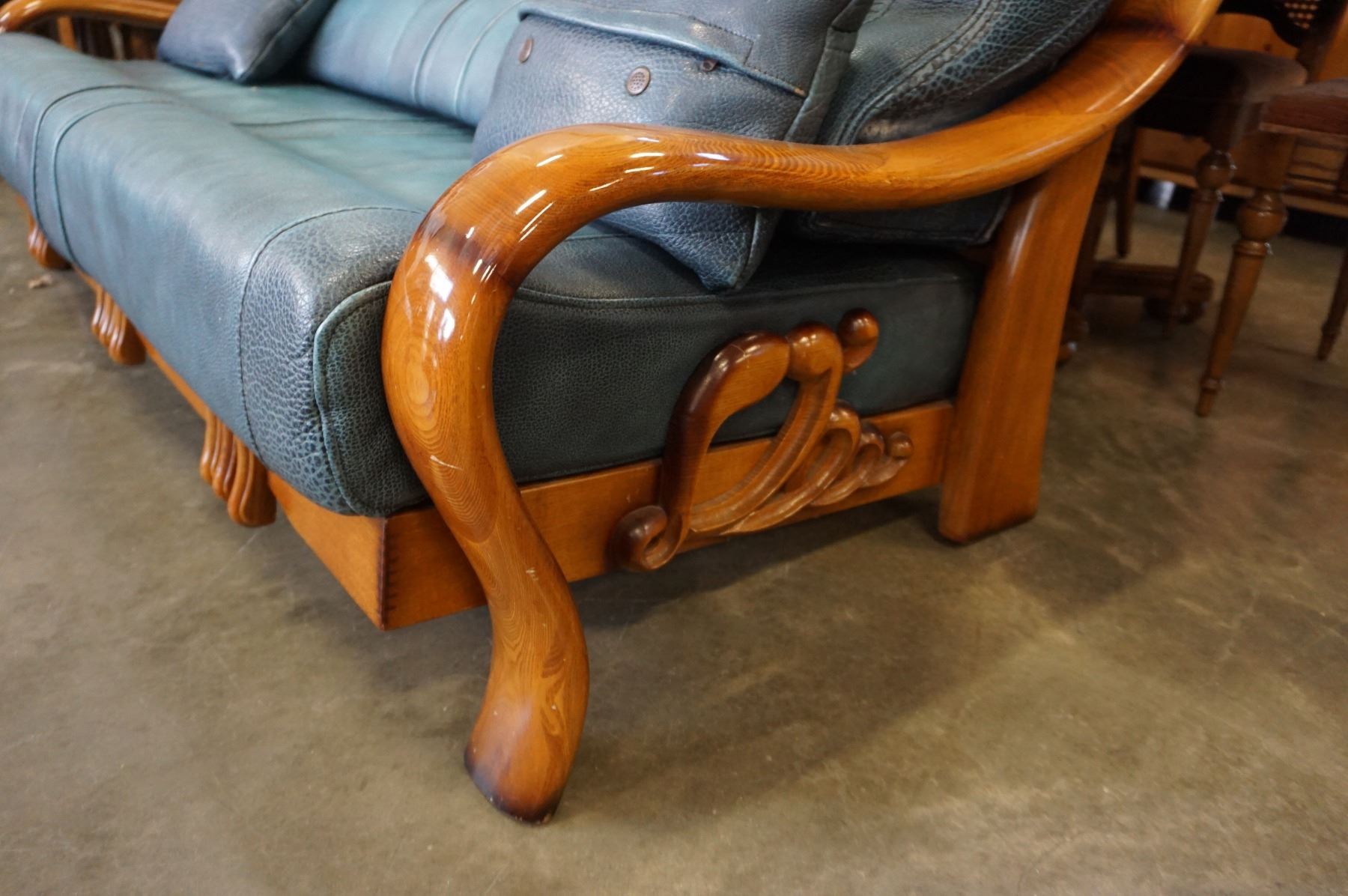 WOOD FRAMED SOFA AND CHAIR W/ TEAL BUFFALO HIDE CUSHIONS AND THROW PILLOWS
