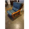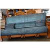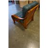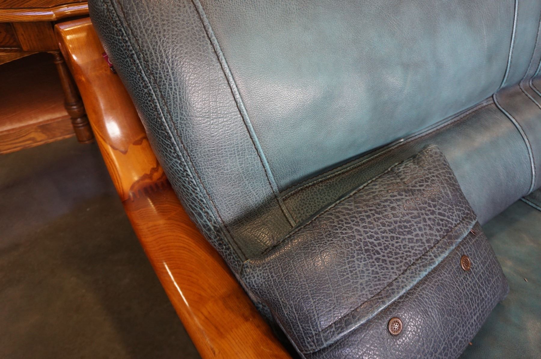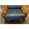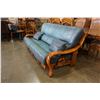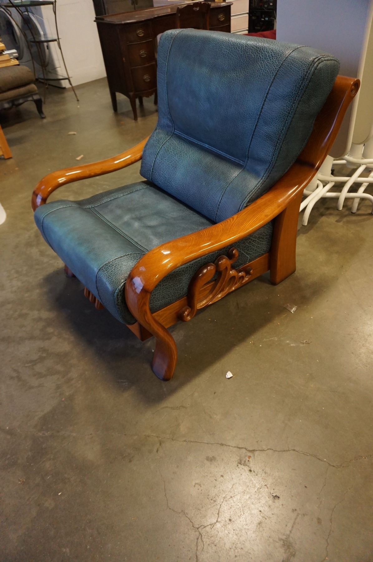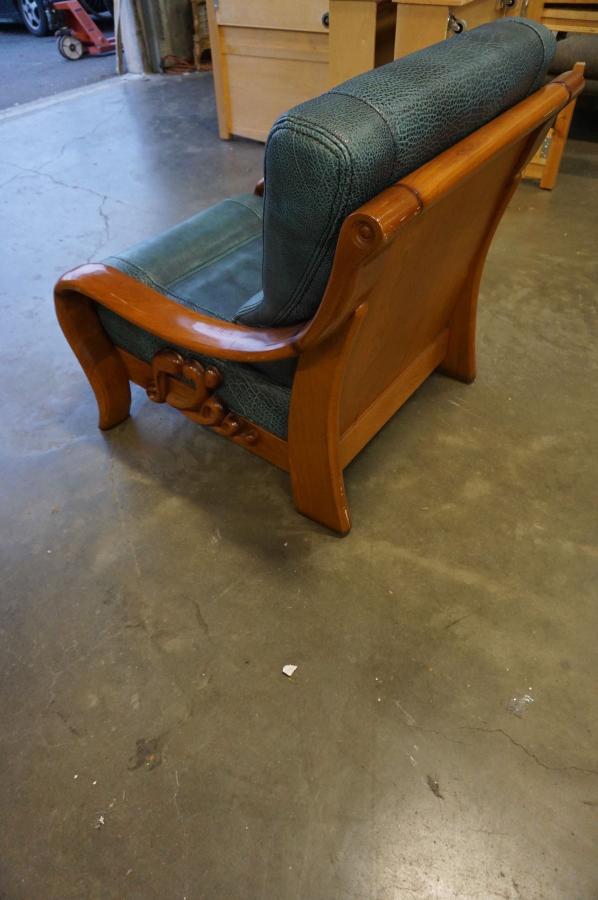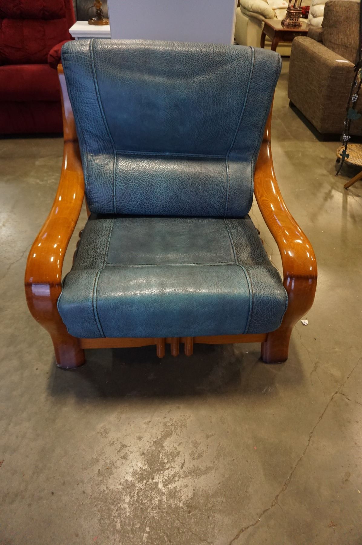 WOOD FRAMED SOFA AND CHAIR W/ TEAL BUFFALO HIDE CUSHIONS AND THROW PILLOWS