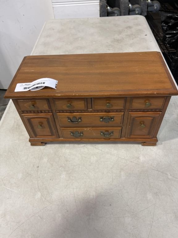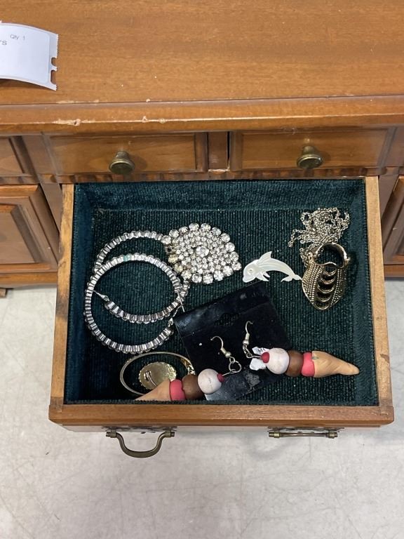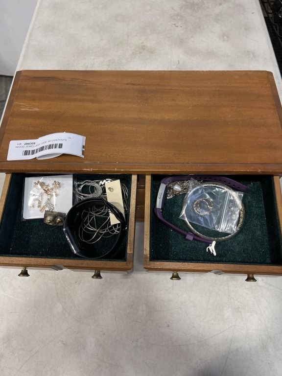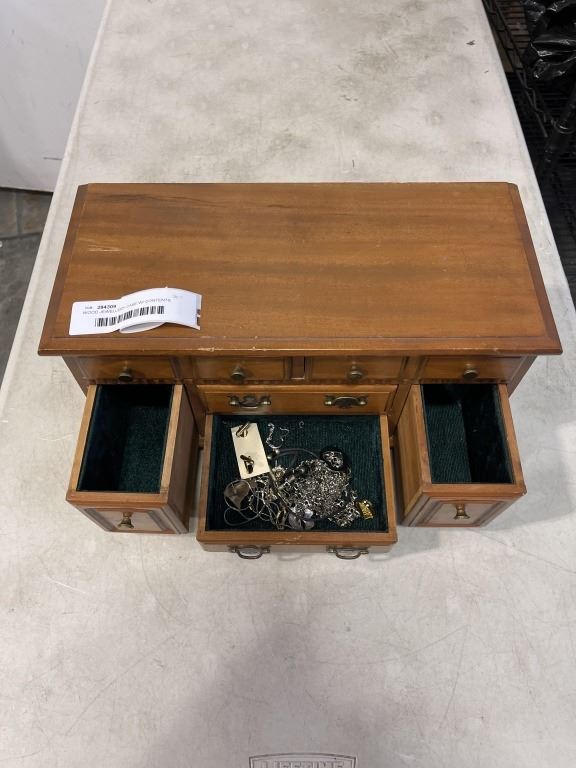 WOOD JEWELLERY CASE W/ CONTENTS