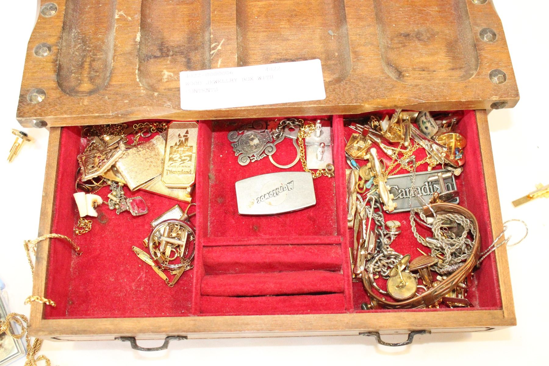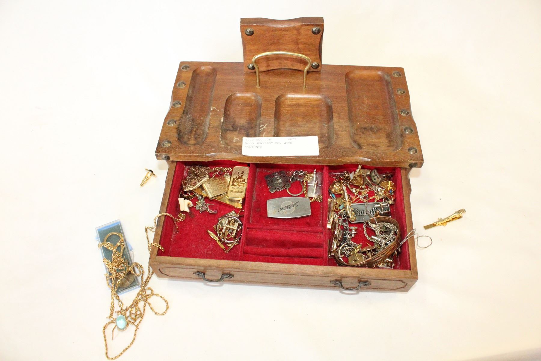 WOOD JEWELLRY BOX WITH CONTENTS
