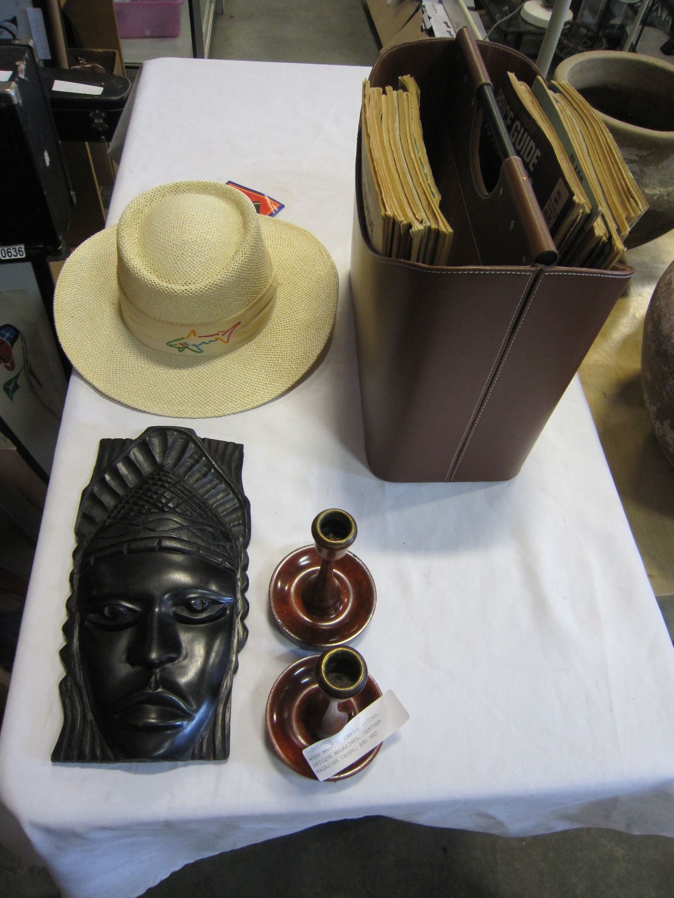 WOOD MASK, 2 CANDLE STICKS, ANTIQUE MAGAZINES, LEATHER MAGAZINE CADDY, AND HAT