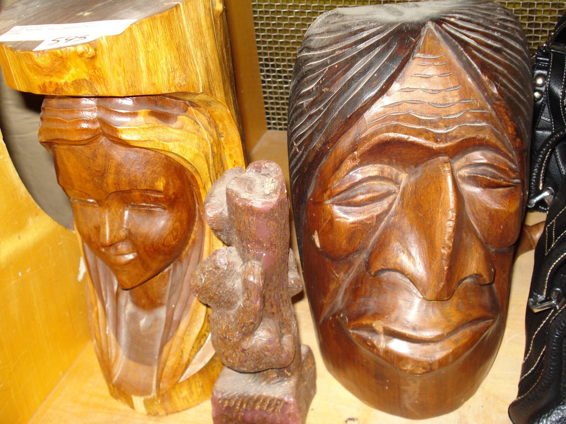 WOOD MASKS AND CARVED WOOD STUMP