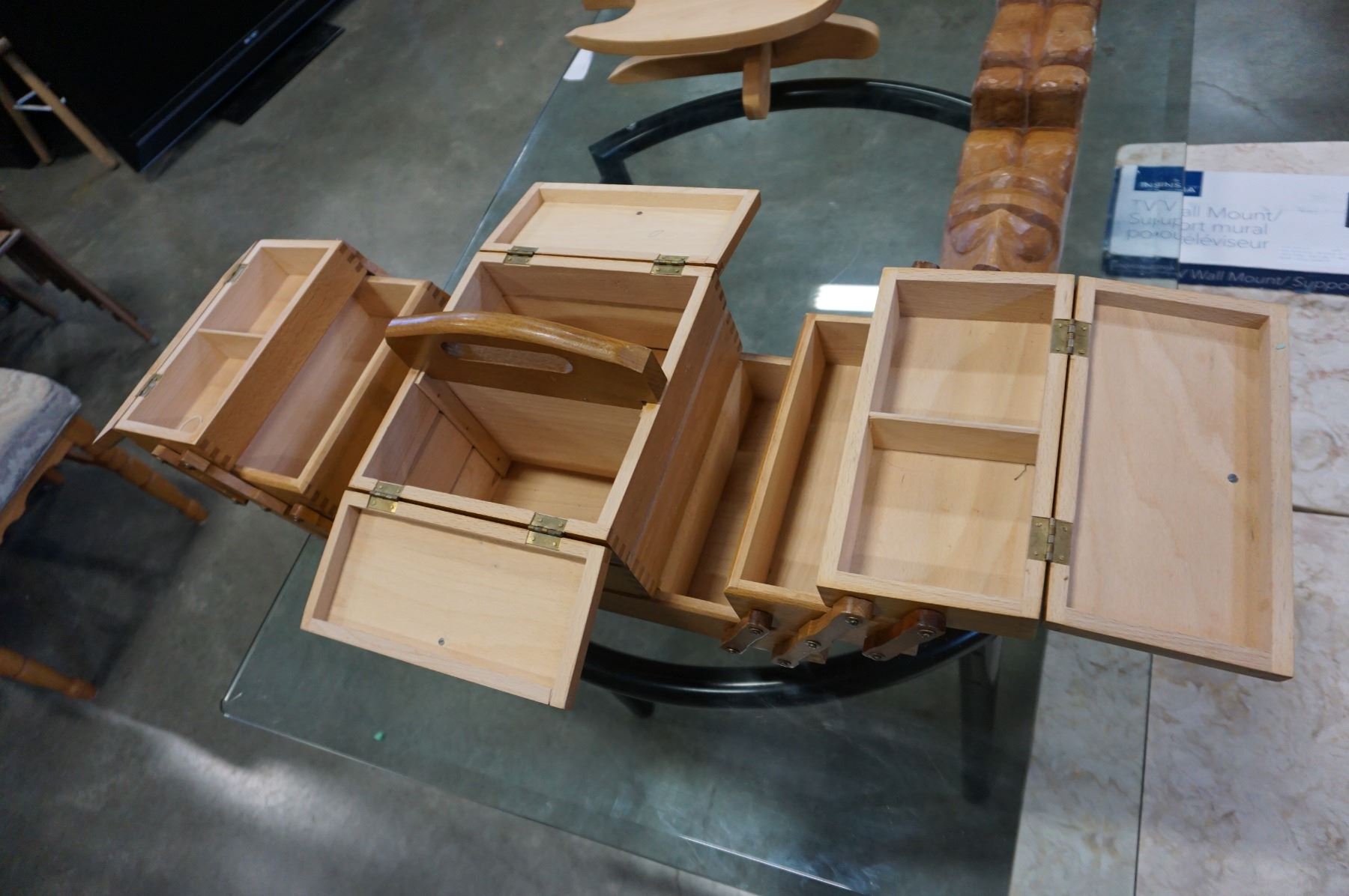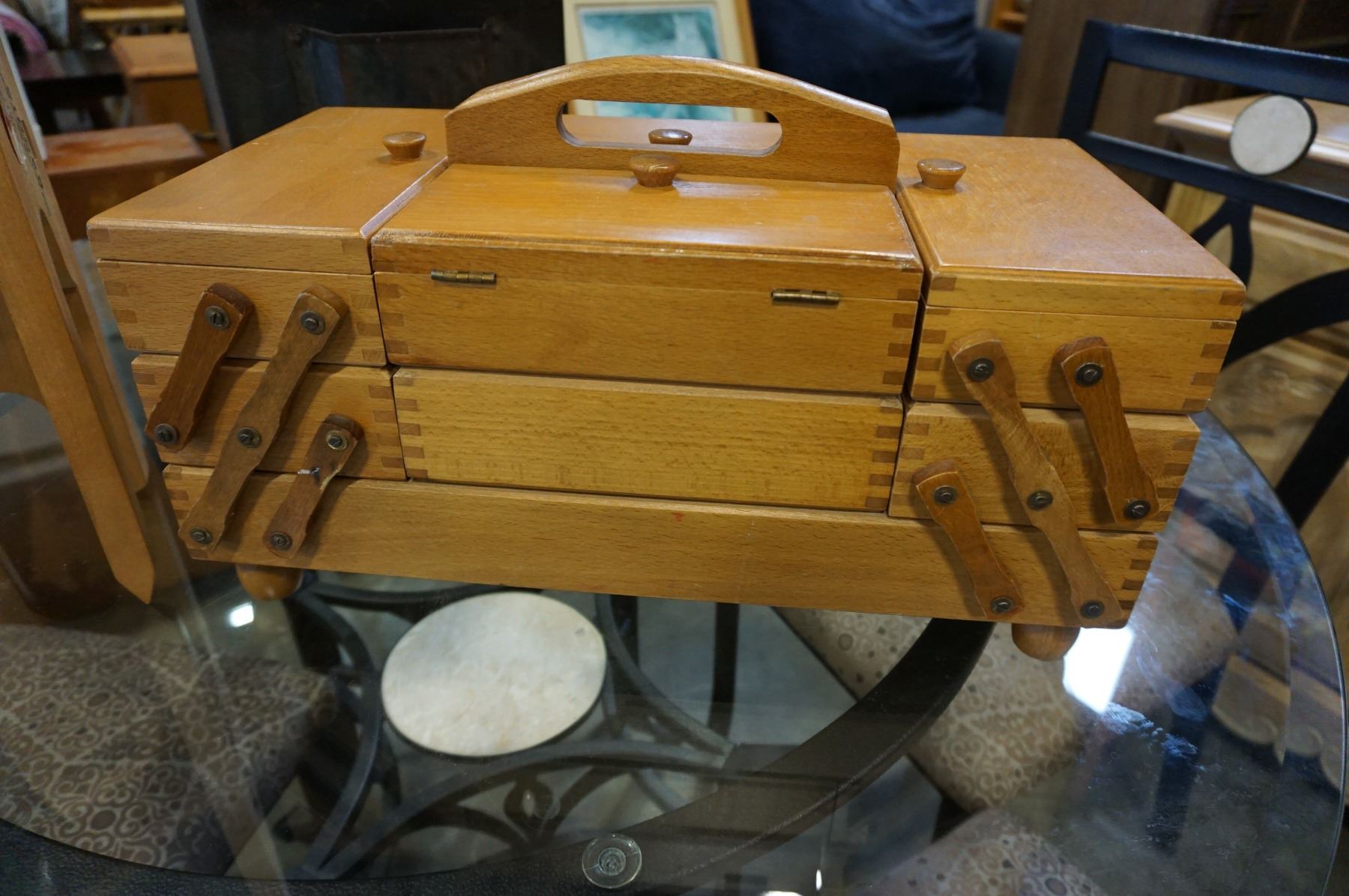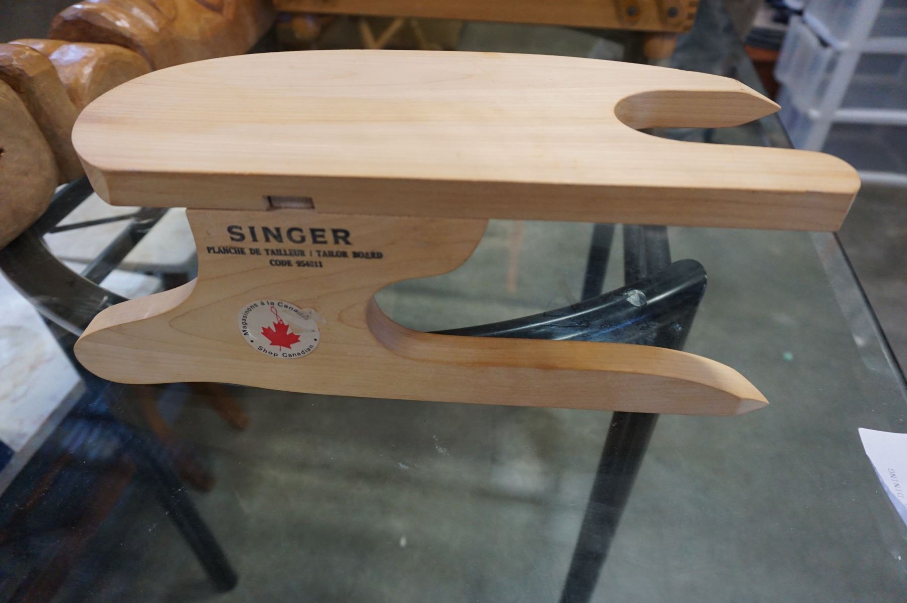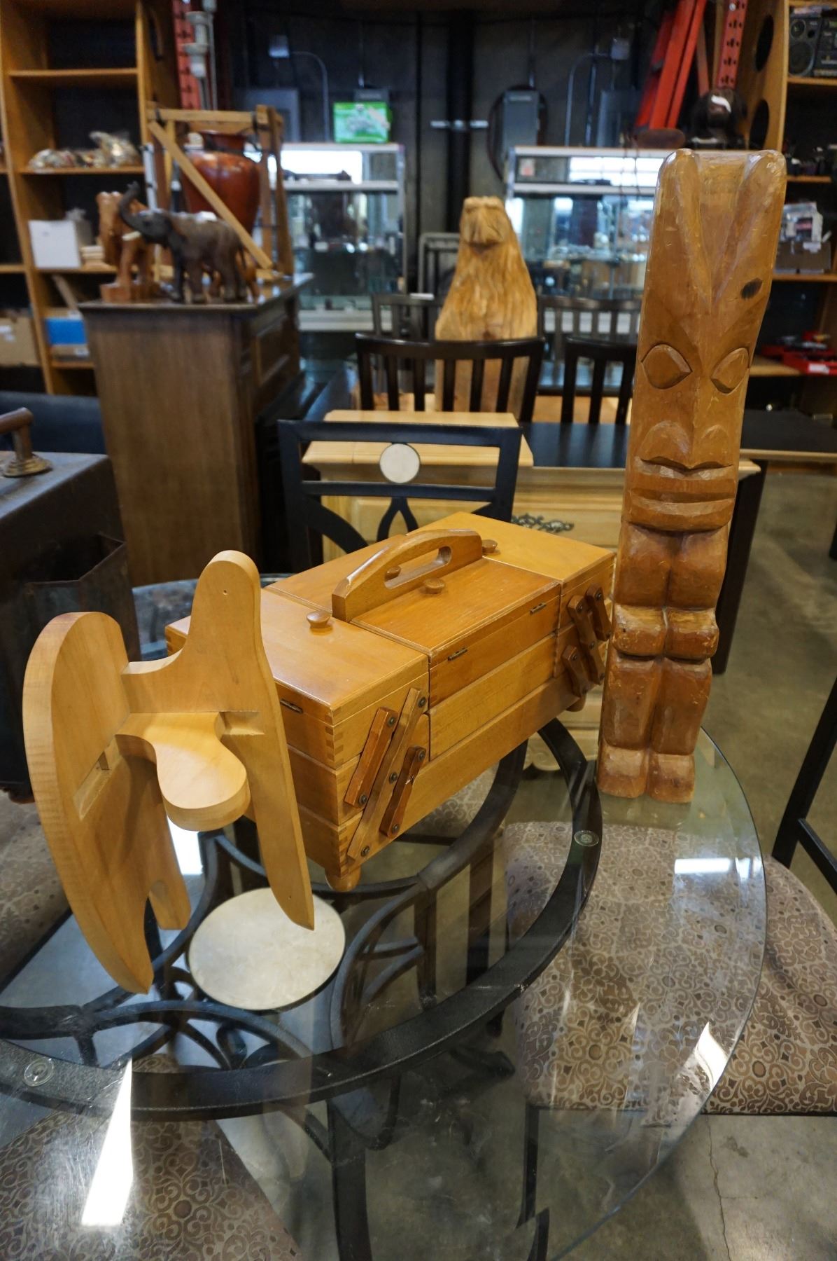 WOOD SEWING BASKET, WOOD CARVING, AND SINGER SEWING TOOL