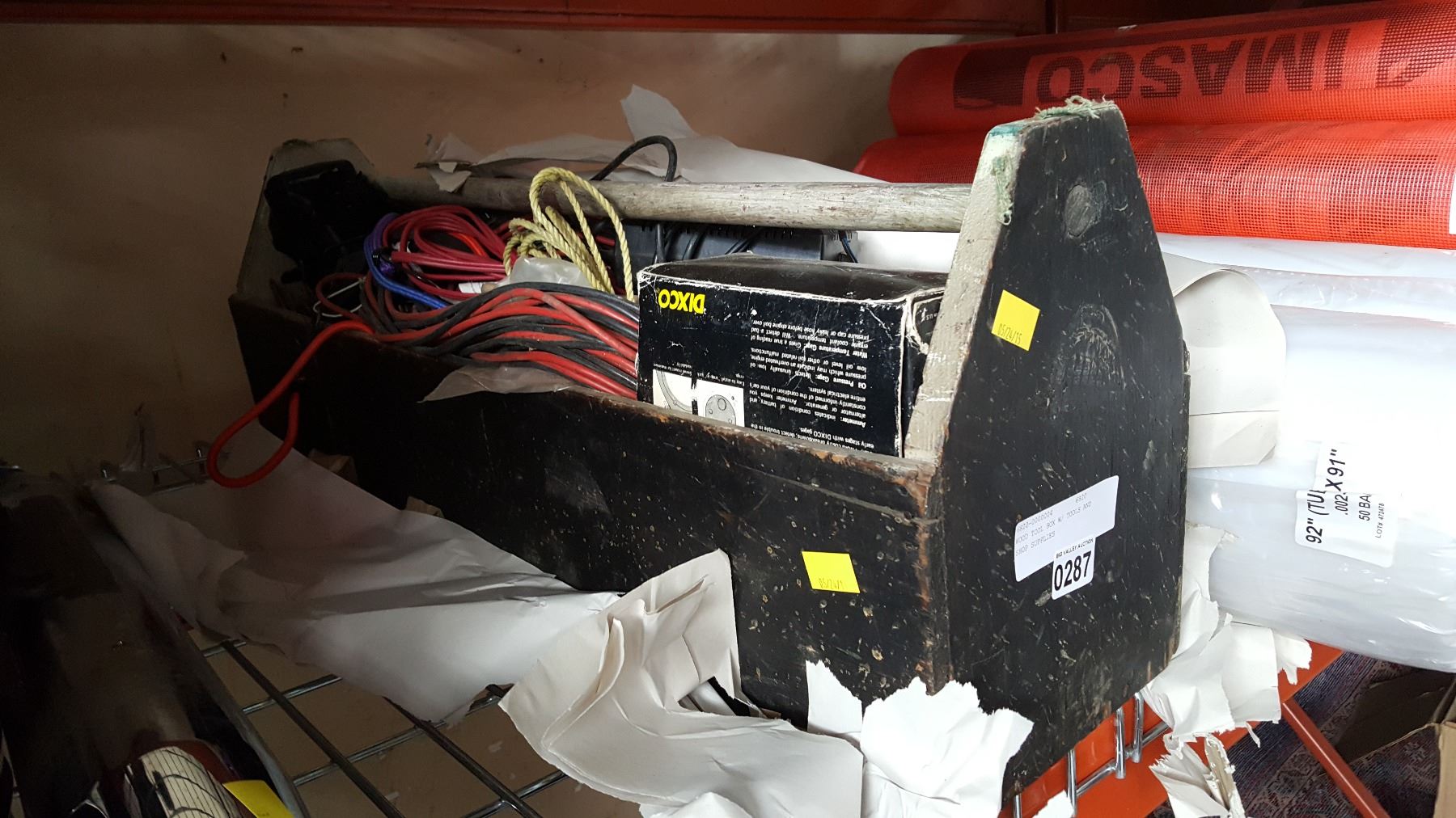 WOOD TOOL BOX W/ TOOLS AND SHOP SUPPLIES