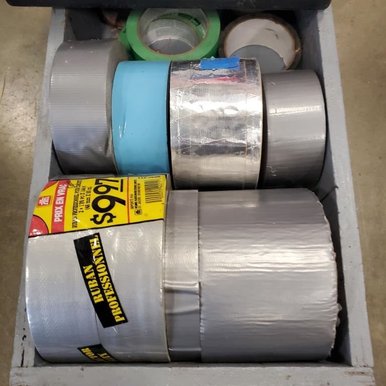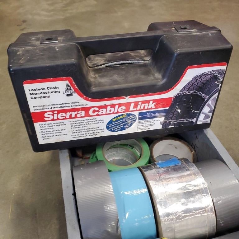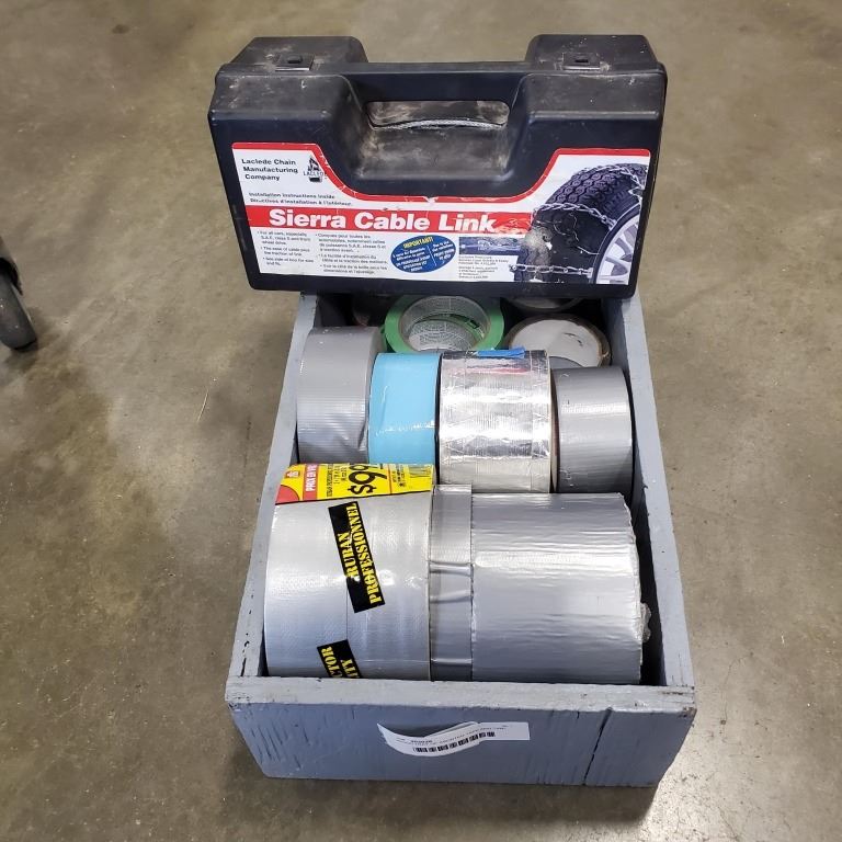 WOOD TRAY OF ASORTED TAPE AND TIRE CHAINS