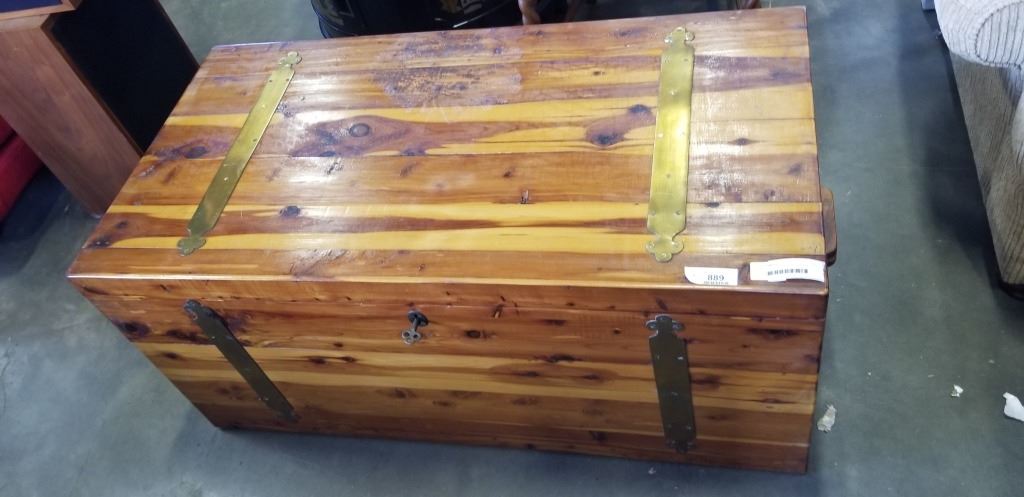 WOOD TRUNK WITH KEY 45" X 24" X 21" NEEDS REPAIR TO 2 OUT OF 3 HINGES