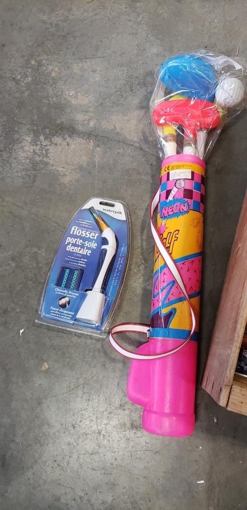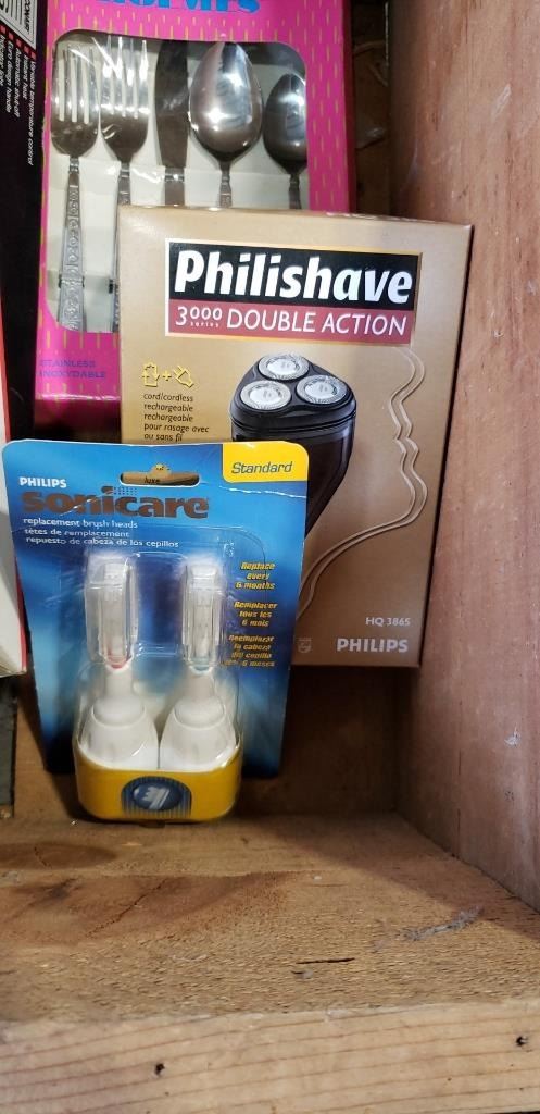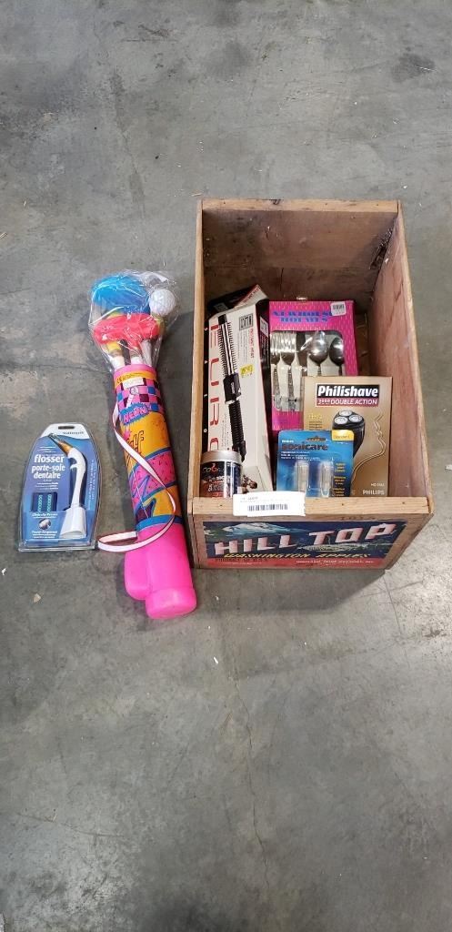WOODEN APPLE CRATE WITH ELECTRIC RAZOR, HAIR CURLER, PHILIPS SONICARE BRUSH HEADS, ETC