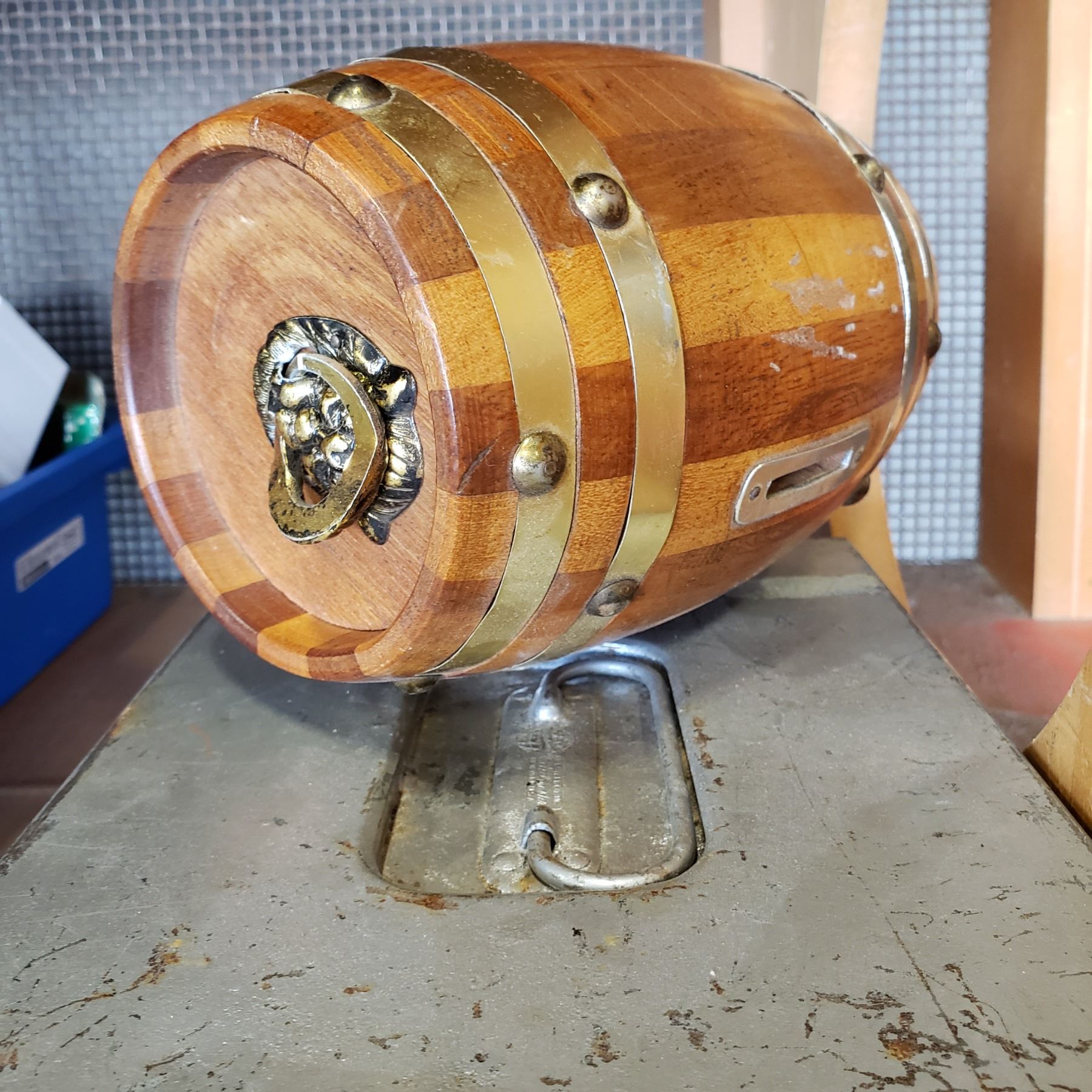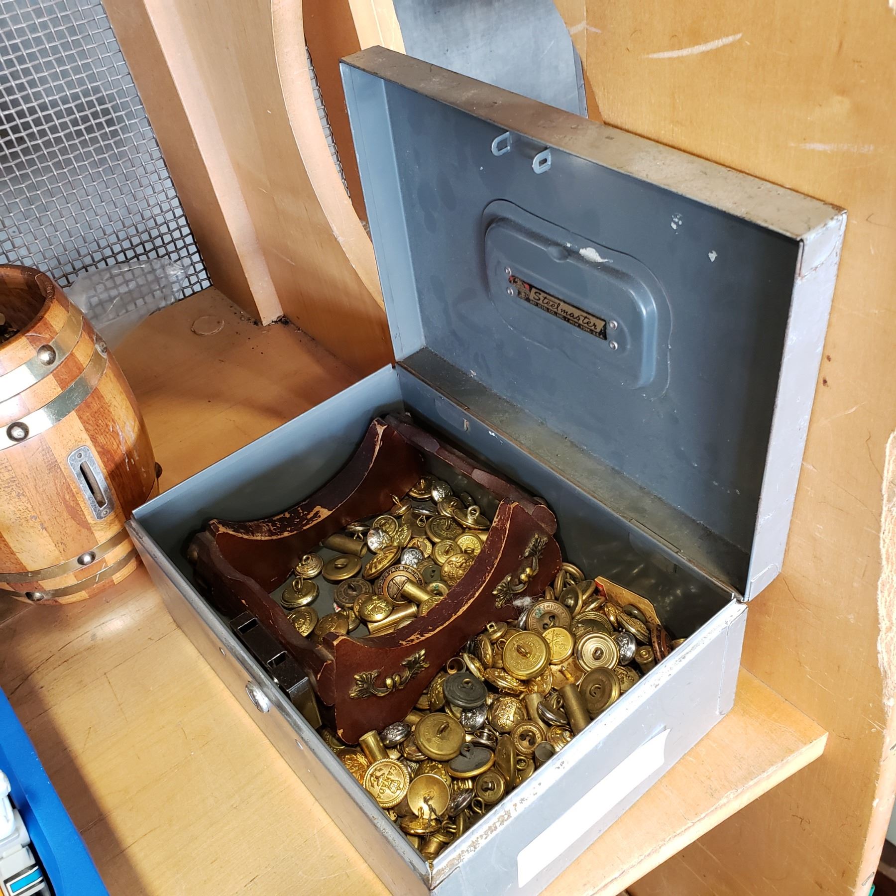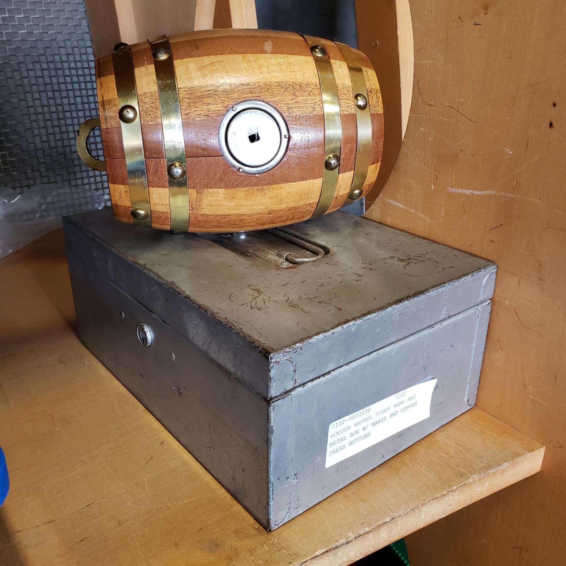 WOODEN BARREL PIGGY BANK AND METAL BOX W/ BRASS AND COPPER DRESS BUTTONS