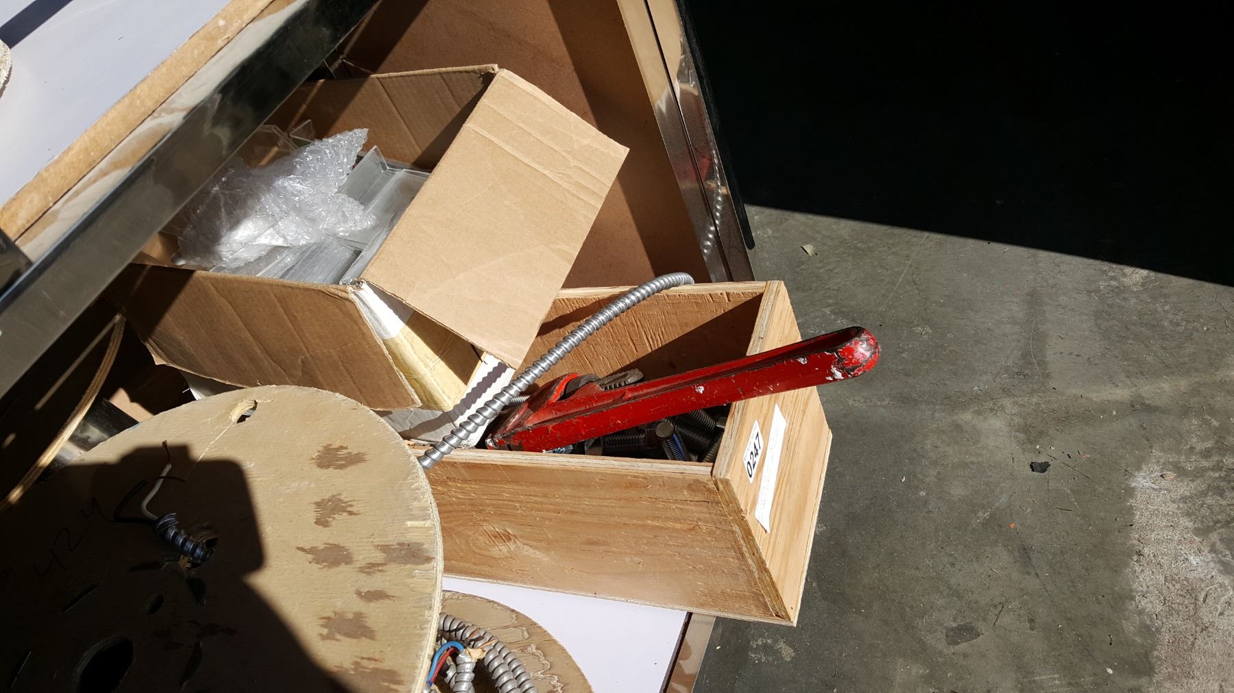 WOODEN BOX OF BOLTS AND NUTS AND PIPE WRENCH AND SMALL PLASTIC CARD HOLDERS