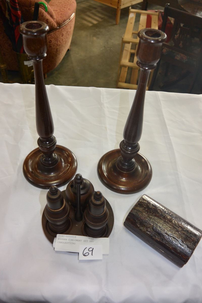 WOODEN CONDIMENT SET AND CANDLESTICKS