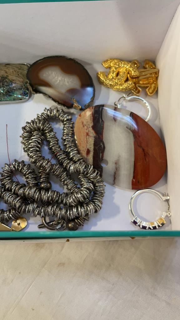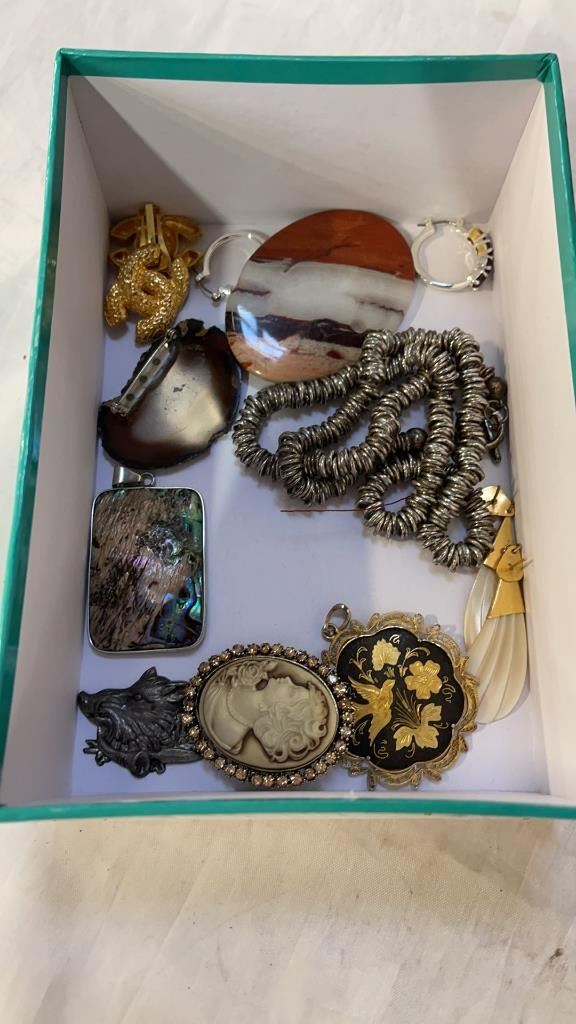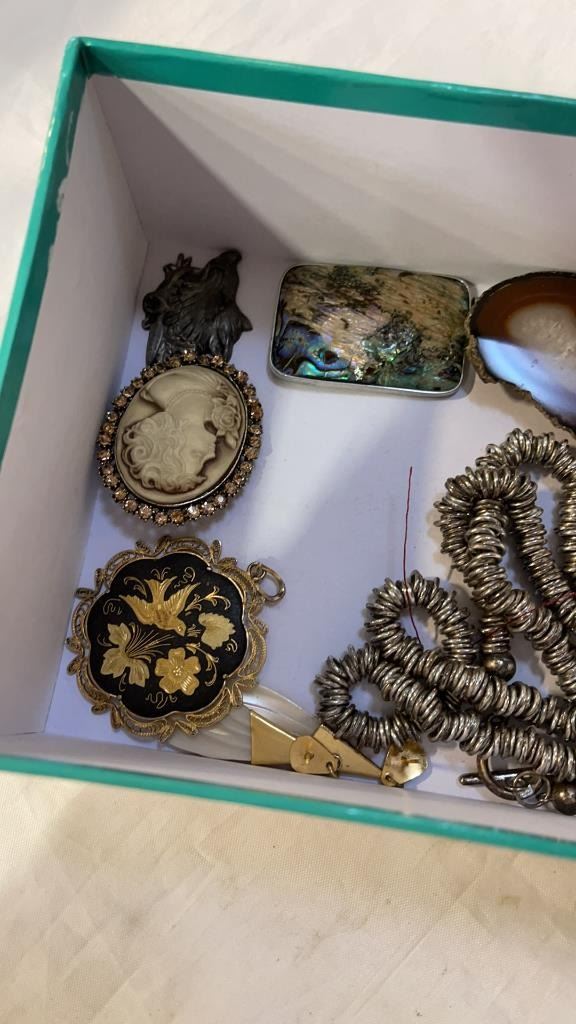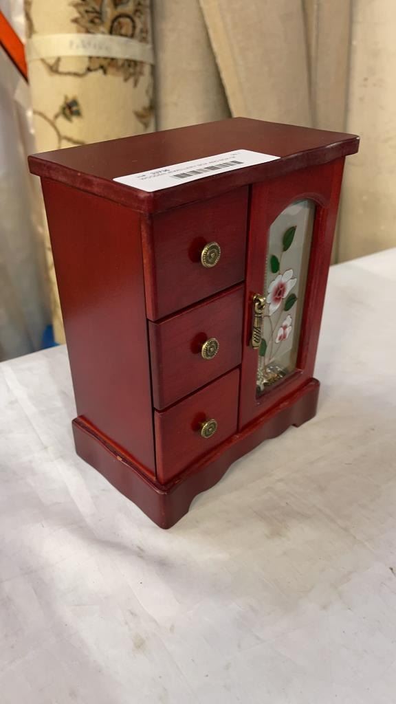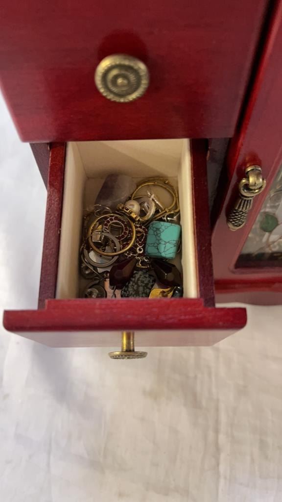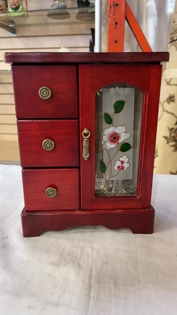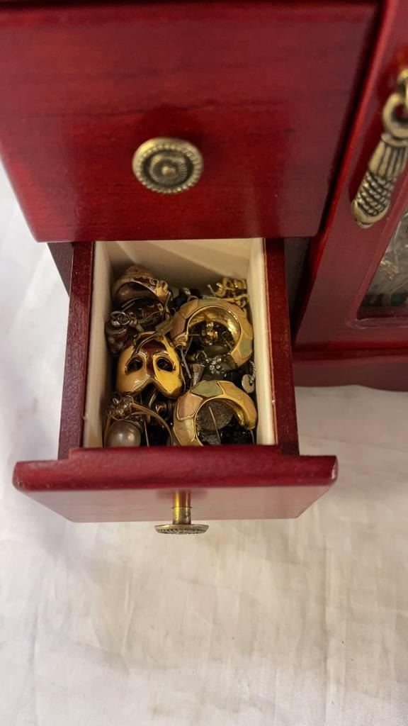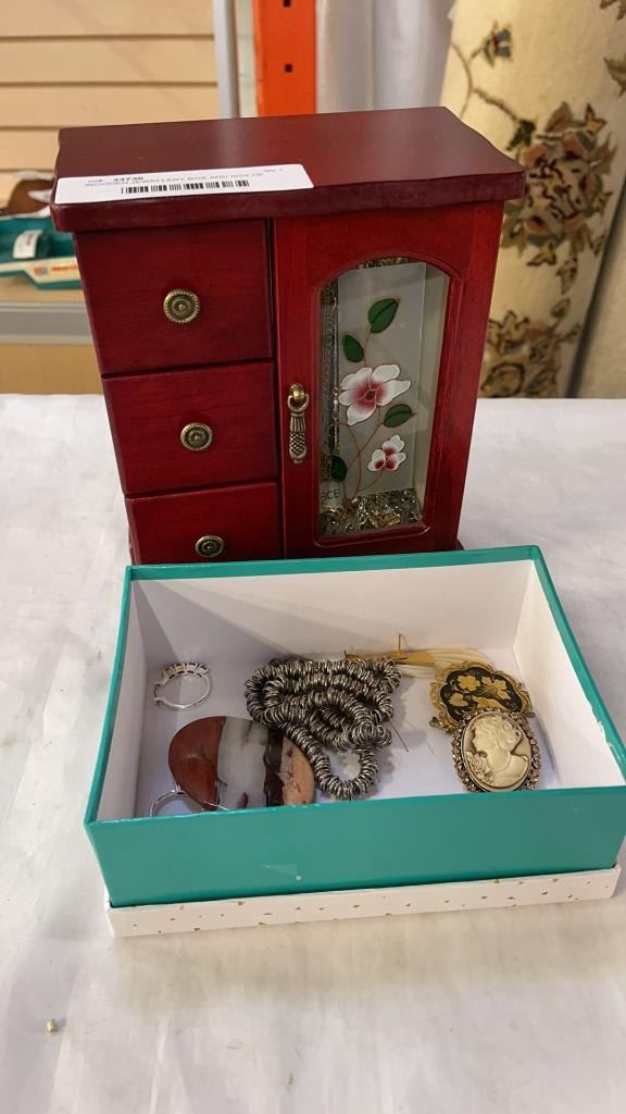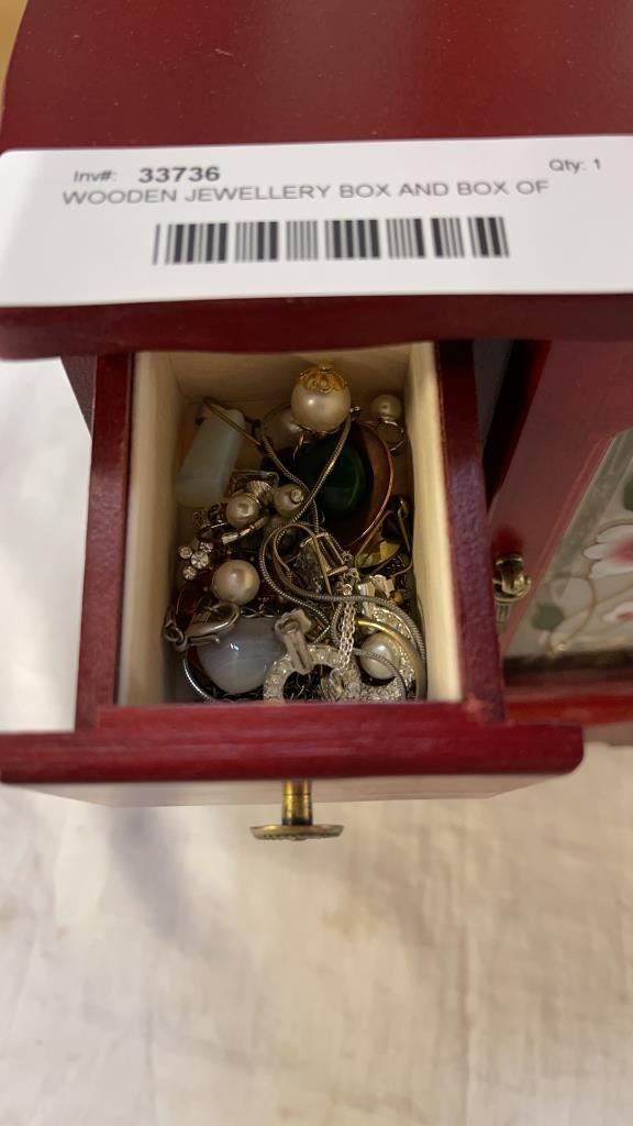 WOODEN JEWELLERY BOX AND BOX OF VARIOUS JEWELLERY