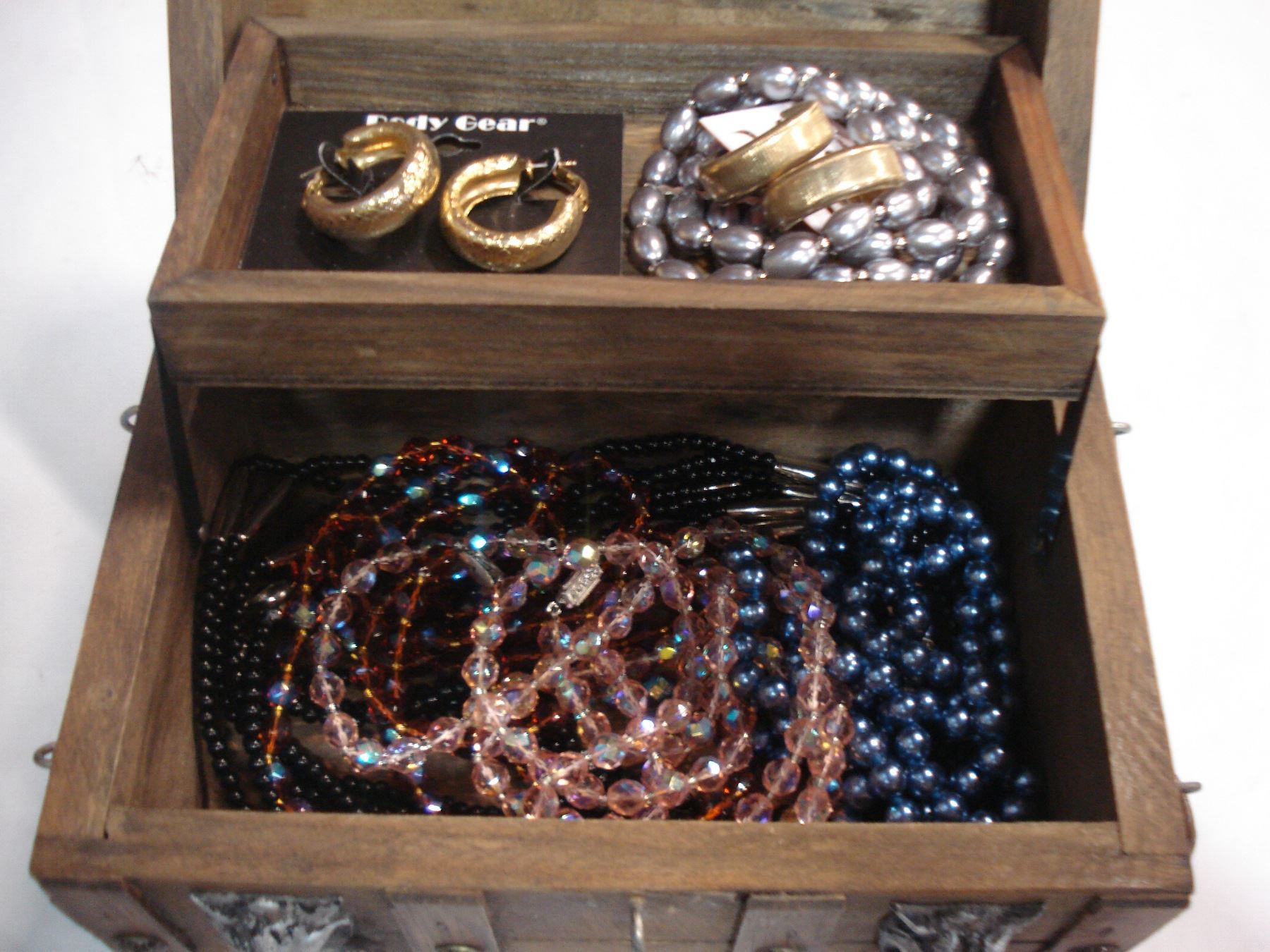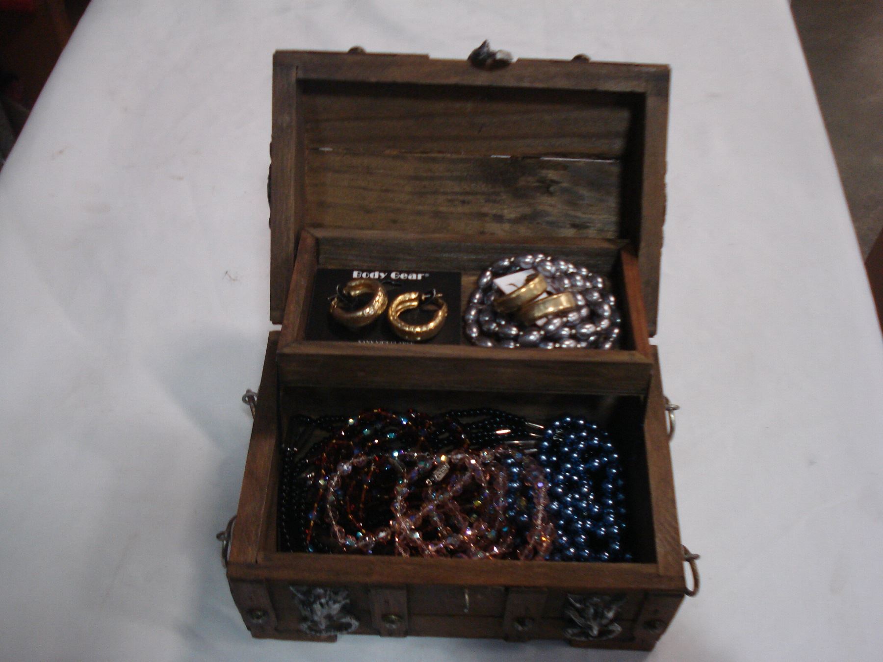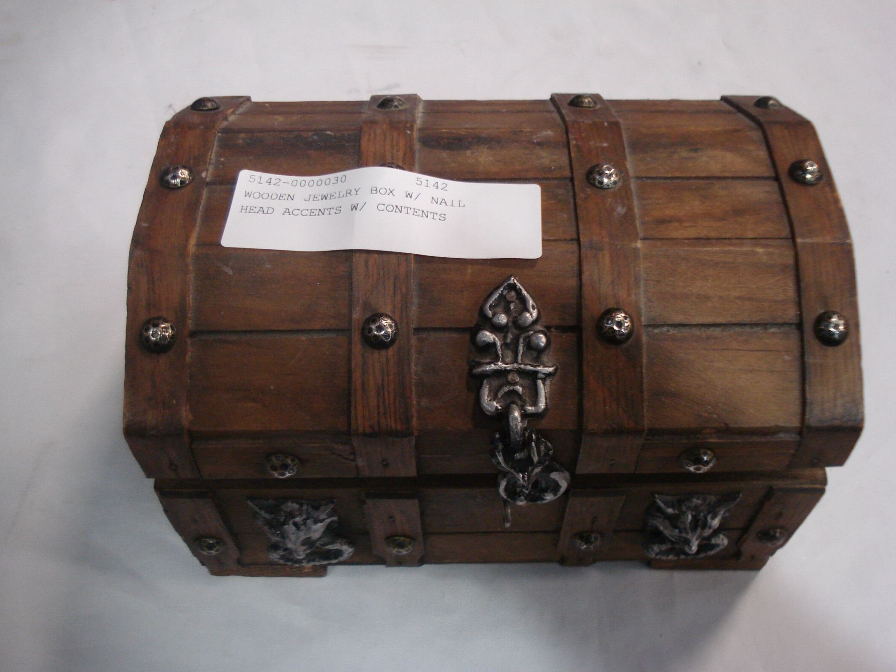 WOODEN JEWELRY BOX W/ NAIL HEAD ACCENTS W/ CONTENTS