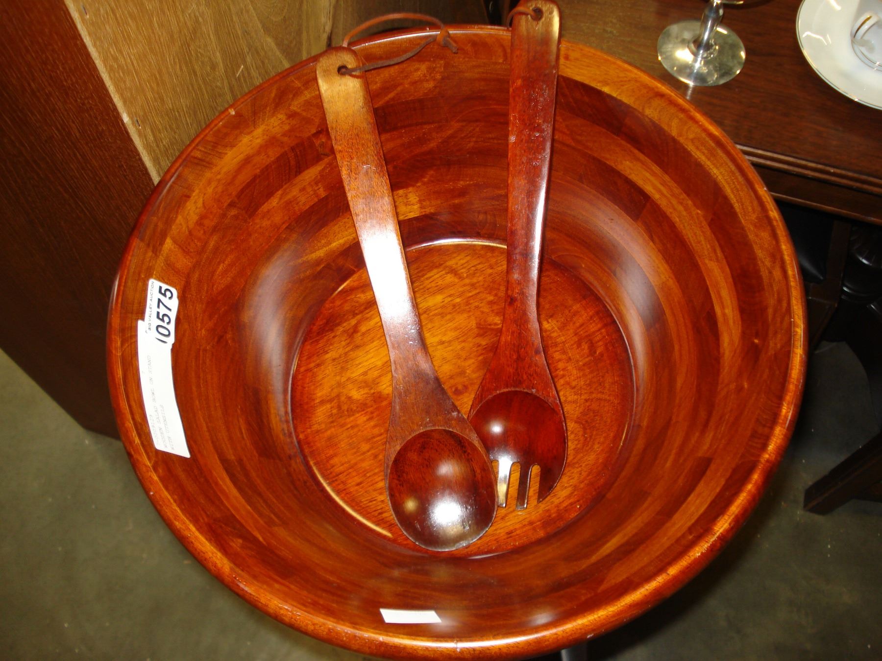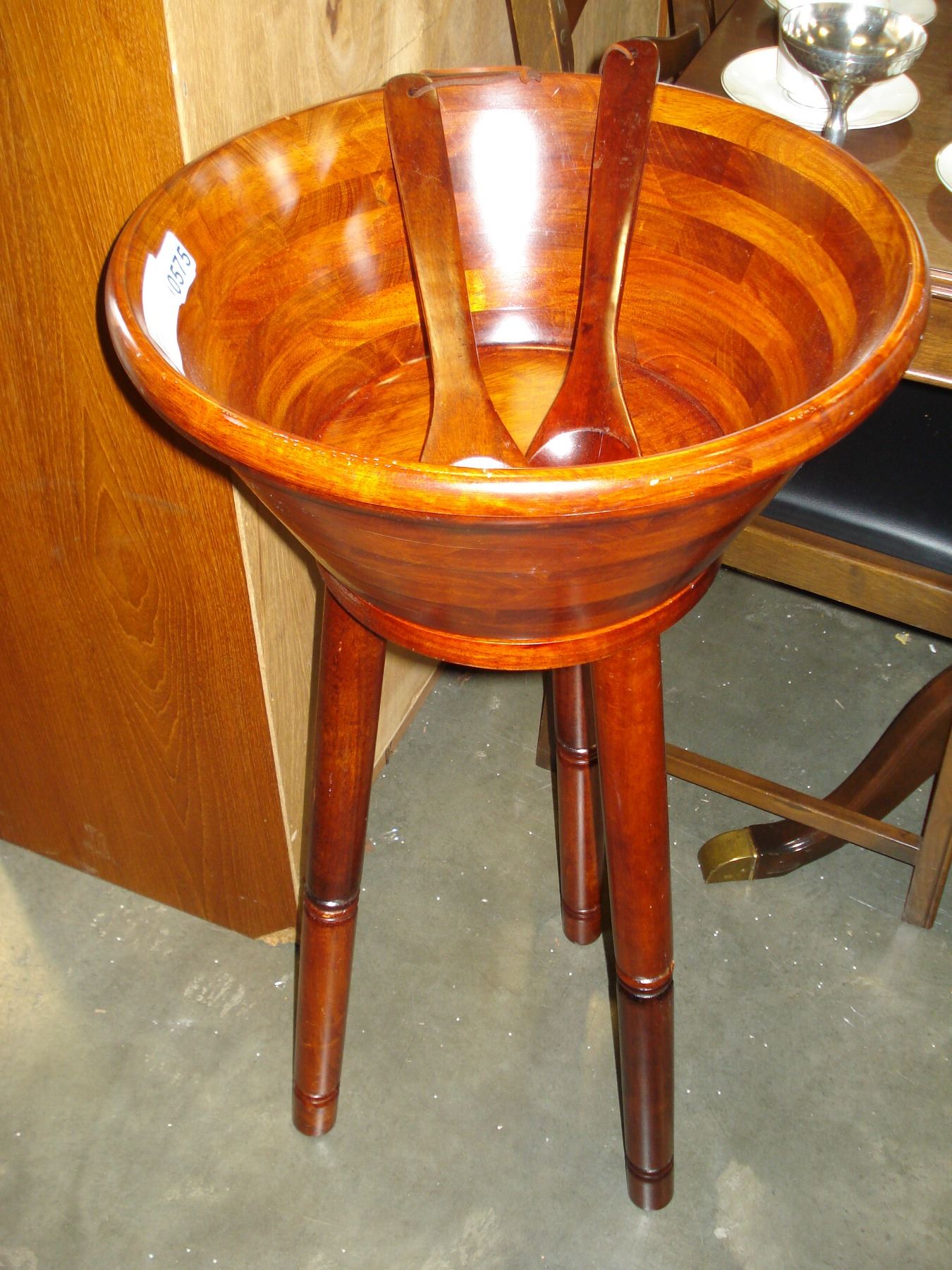 WOODEN SALAD BOWL ON STAND WITH UTENSILS
