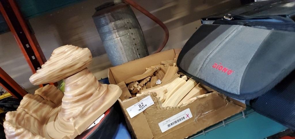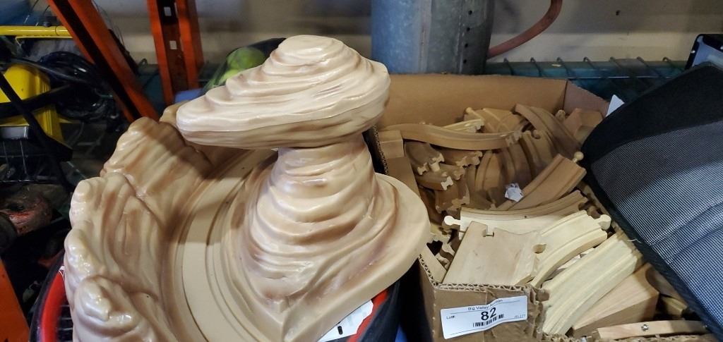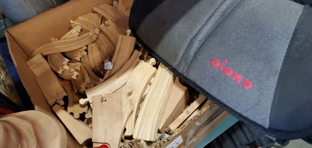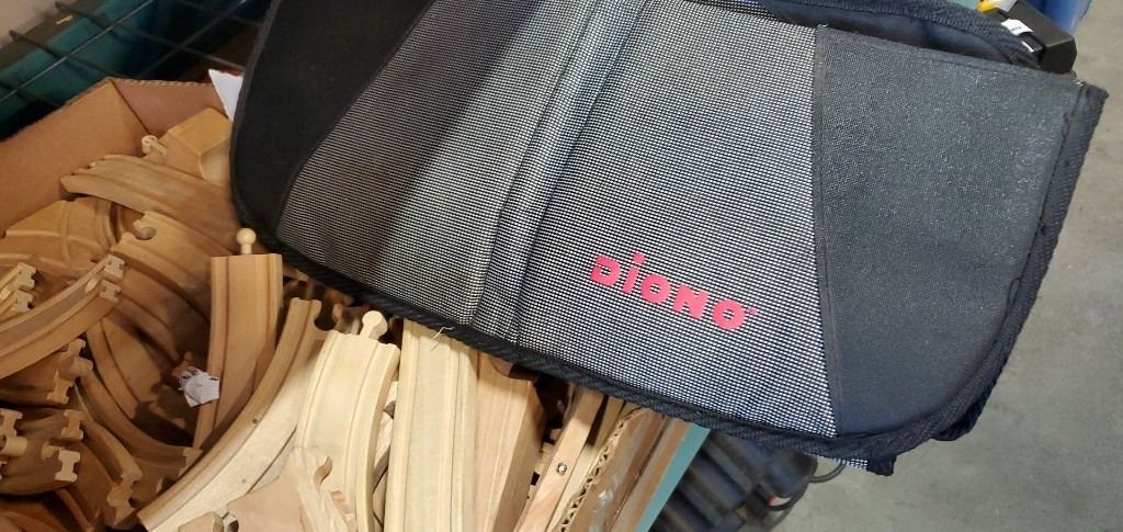 WOODEN TRAIN TRACK, CAR SEAT COVER, AND VINTAGE SPRAYER