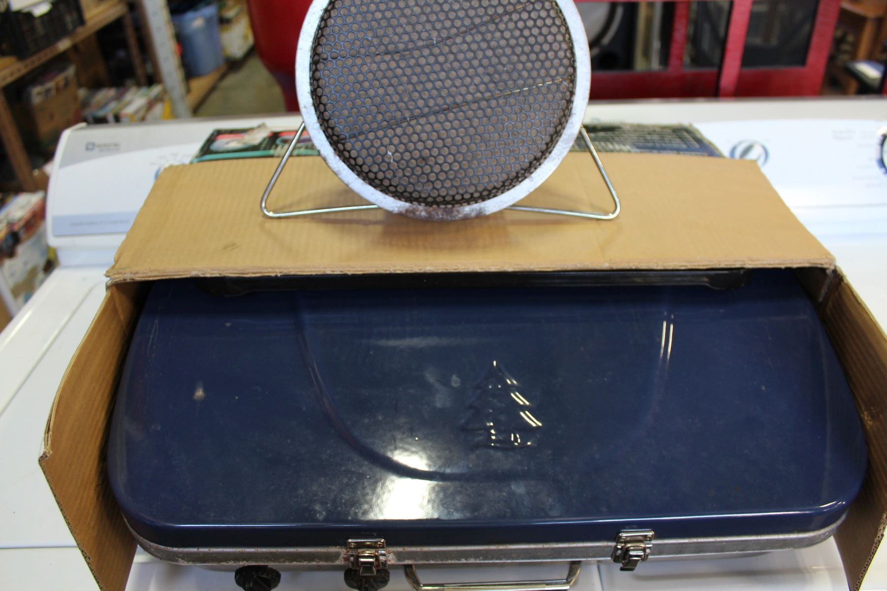 WOODS 2 BURNER PROPANE STOVE IN BOX AND COLEMAN PROPANE HEATER