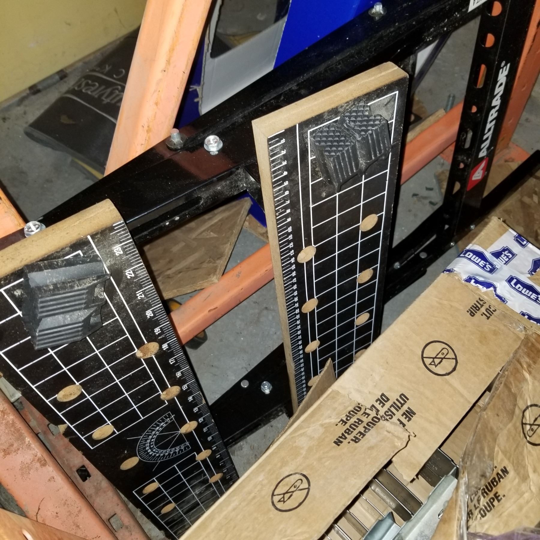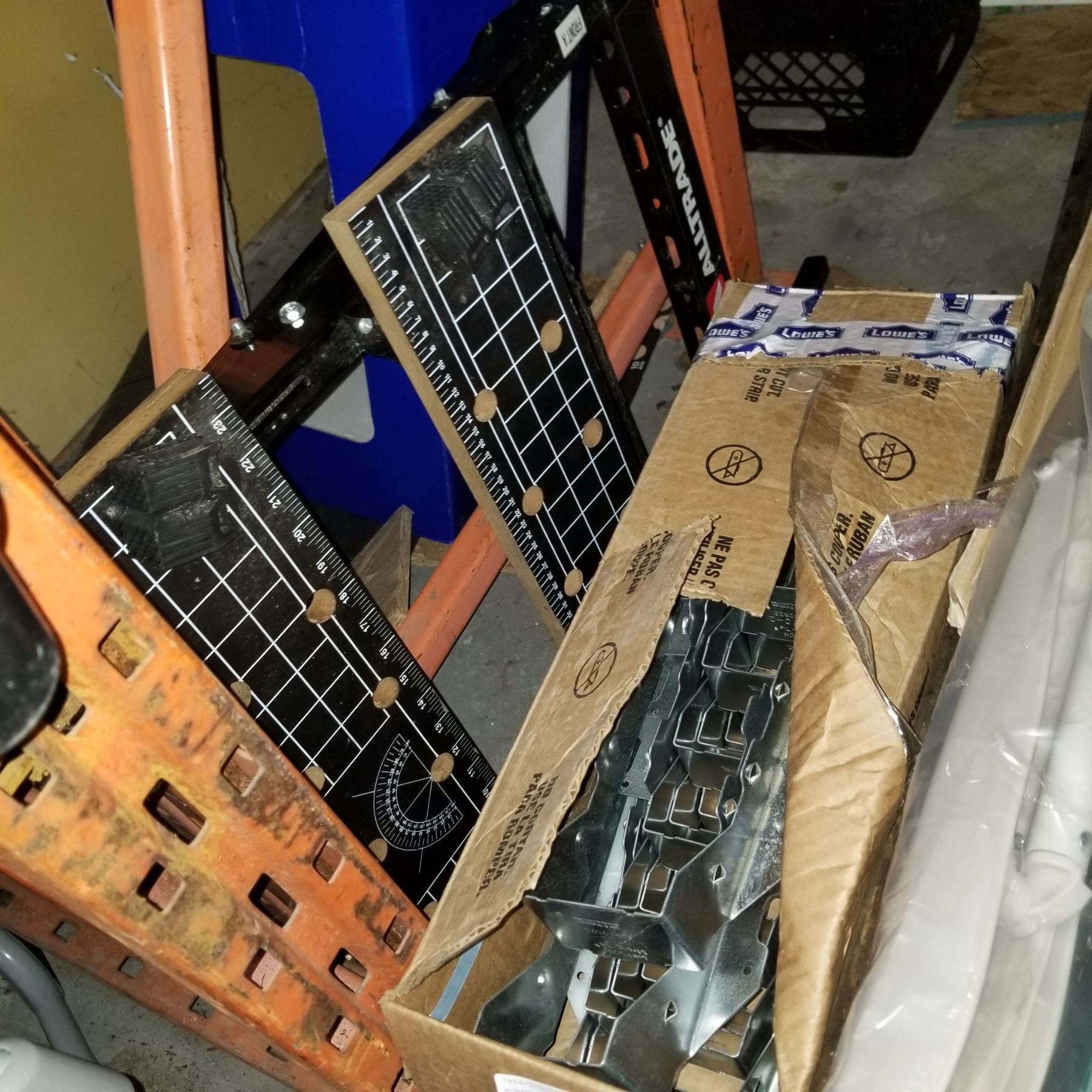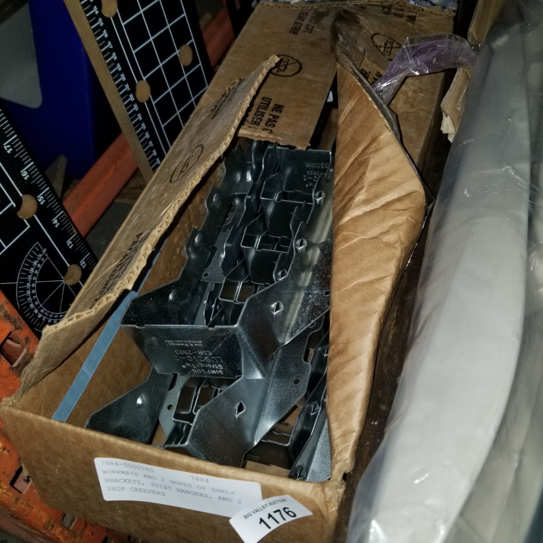 WORKMATE AND 2 BOXES OF SHELF BRACKETS, JOIST HANGERS, AND 2 SHOP CREEPERS
