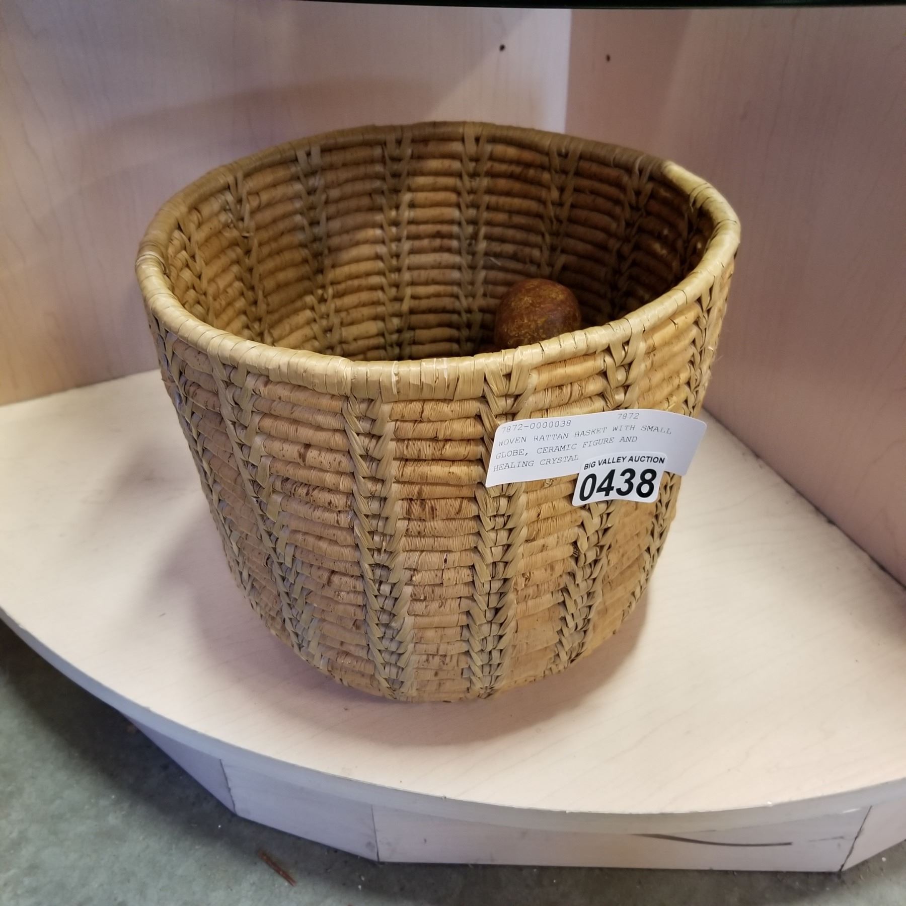 WOVEN RATTAN BASKET WITH SMALL GLOBE, CERAMIC FIGURE AND HEALING CRYSTAL